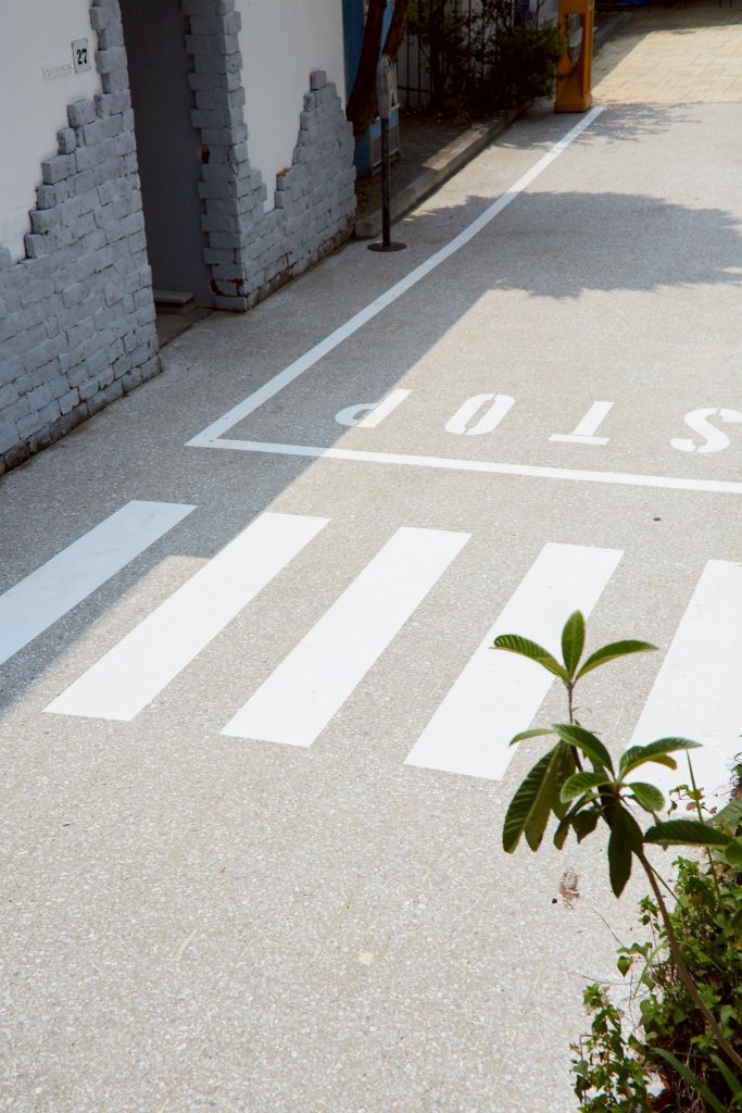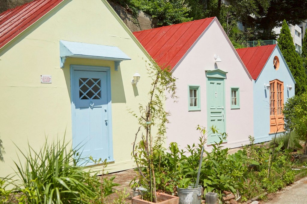 小さな教会の先に、パステルカラーのカラフルな3軒の小さな家、横断歩道や、英国雰囲気の漂う電話ボックスのフォトスポットなど様々なストーリーを感じさせる空間です。