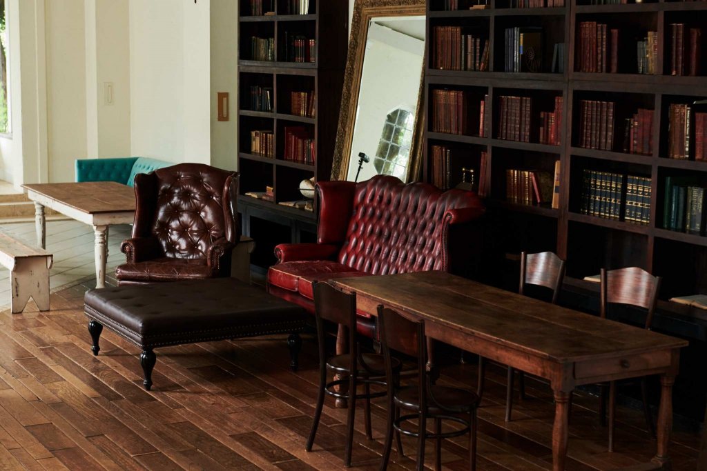 またエントランスを入り、OLD AVENUEのSTREETとは反対の右手に進むと大きな本棚にたくさんの古書が並んだ屋内スペースがあります。本棚を背景にすると重厚なイメージに。ここではFUDGEのメインカメラマンに撮影してもらえる撮影体験コンテンツをご用意してます。