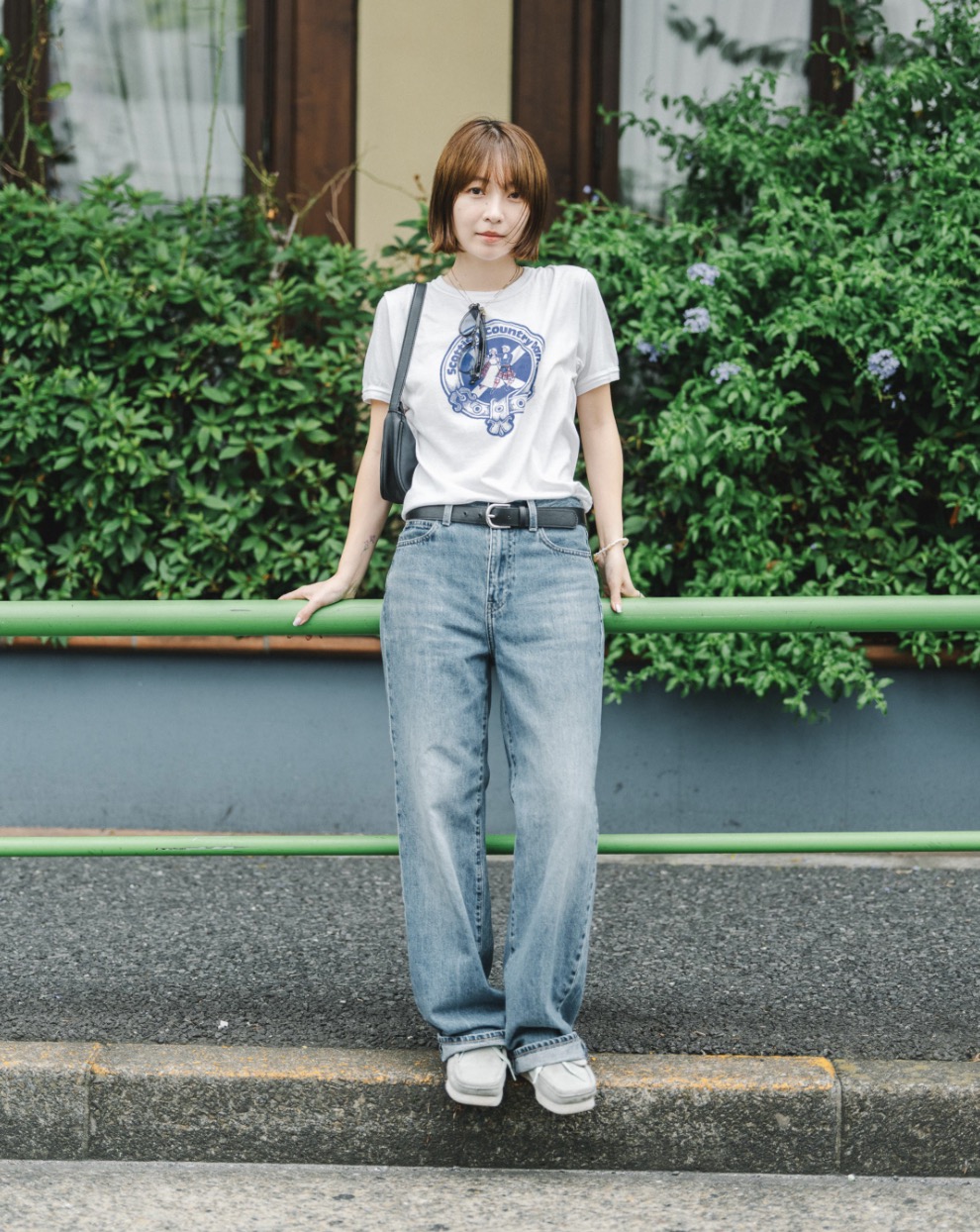 ボーイフレンドデニムにホワイトTシャツを合わせた着こなしは、まるでパリジェンヌ。彼女のファッションルールは、小物で遊びを入れること。この日はパイソン柄のシューズで彩りをプラス。