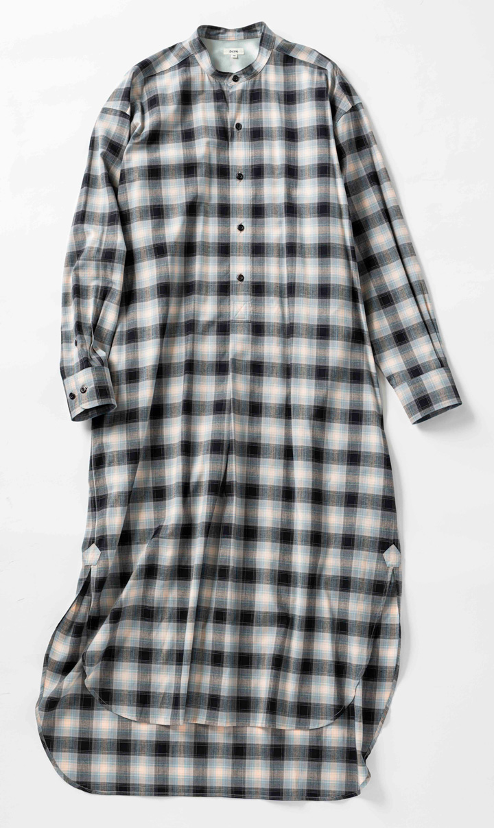 さらさらと肌の上をすべるような心地良さ。ウール×レーヨン素材のワンピースは、オリジナルチェックが自慢。