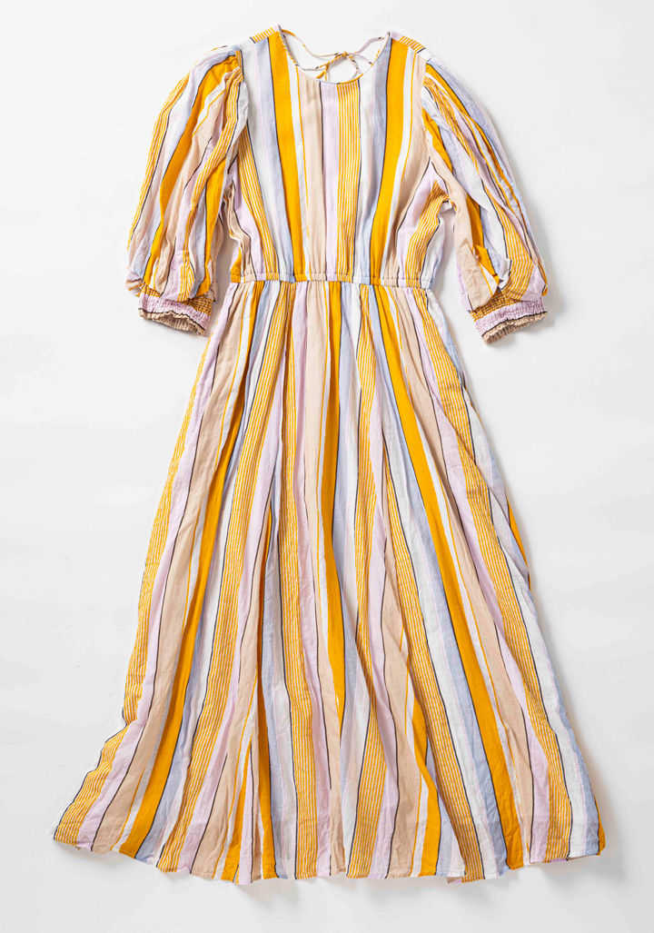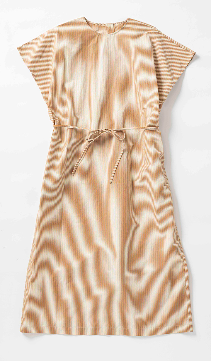 秋色が香るストライプのボリューム袖ワンピースで、ひと足お先に次の季節へ。