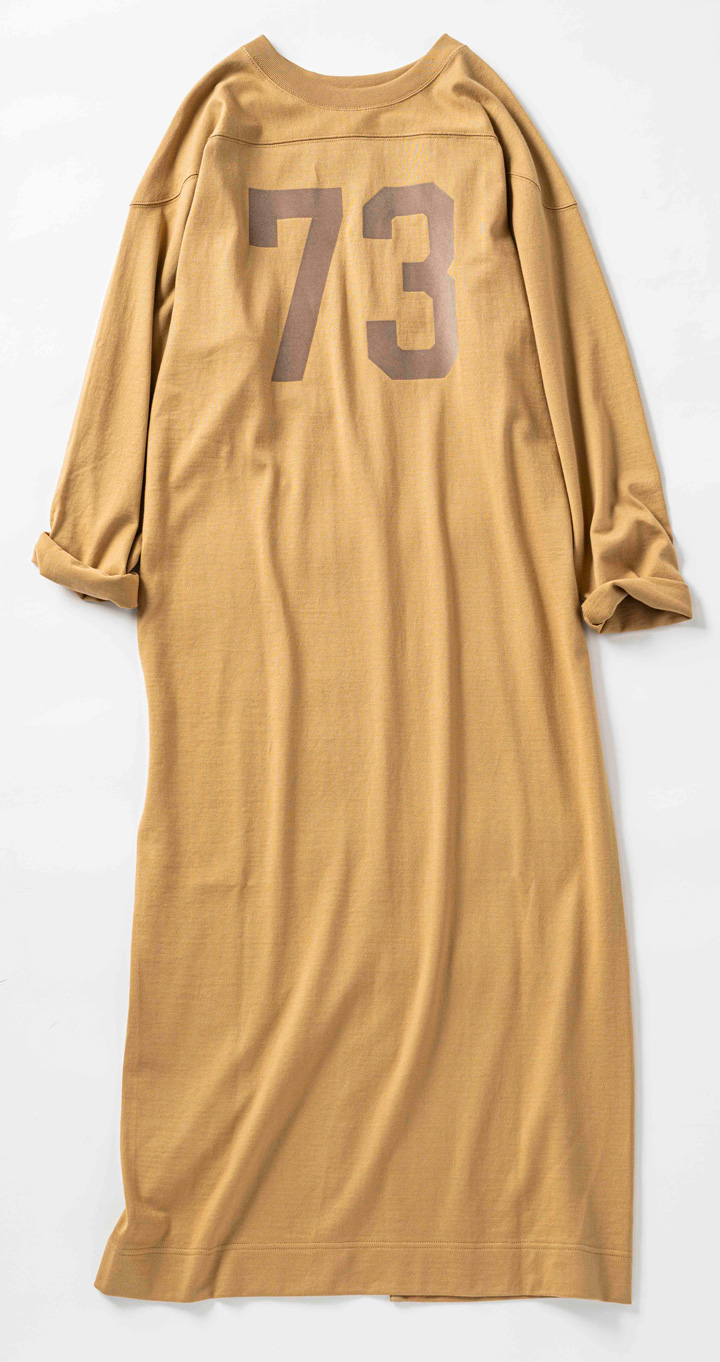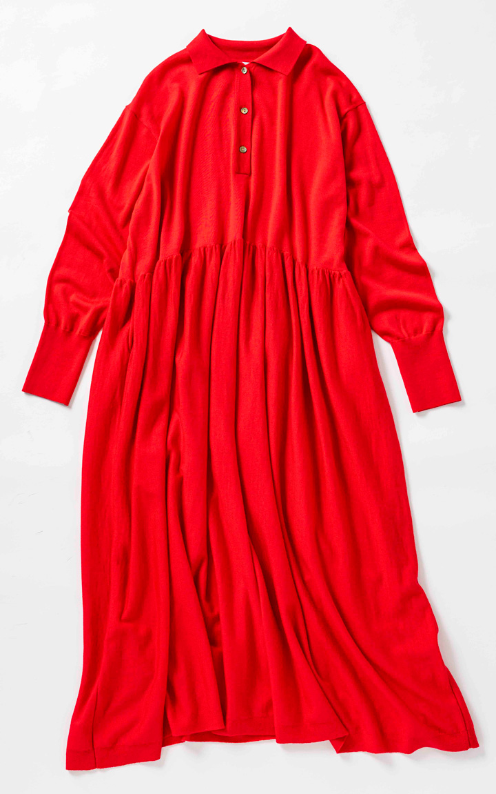 今買って、冬も着られるコットンニットのワンピースも素敵。1 枚はもちろん、身幅を生かしたインナーレイヤードも。