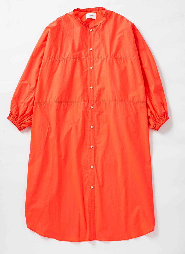 前を開けて羽織りとしても着用できるシャツコートワンピース。袖口にゴムを配し、アレンジがしやすく表情豊かに着こなせる。