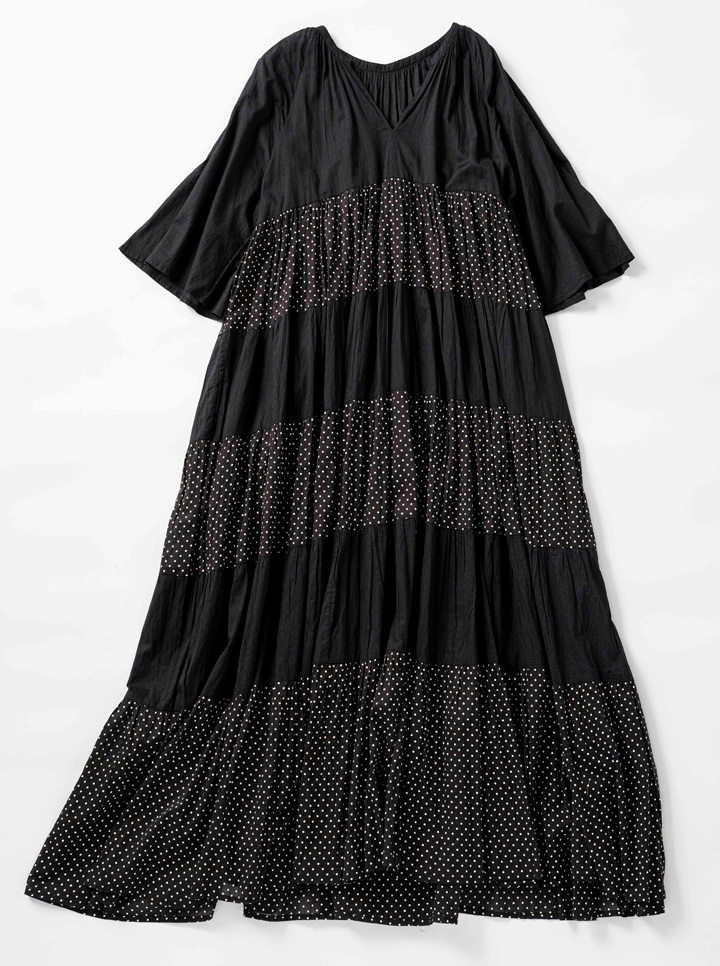軽くて着心地のいいインド綿を使用。愛らしいドット柄も、黒ベースやしわ加工の作用で大人っぽく。