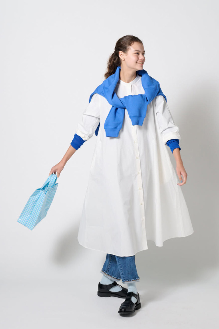 ワンピース¥17930/MidiUmi(マザーズインダストリー)、中に着たカットソー¥18700/three dots(スリードッツ表参道店)、腰に巻いたスウェットシャツ¥4048 /United Athle(キャブ)、デニムパンツ¥23100 / D.M.G.(ドミンゴ)、バッグ¥18700 /TEMBEA(テンベア トウキョウ)、シューズ¥67100 / SANDERS(サンダース ジャパン)、その他/スタイリスト私物