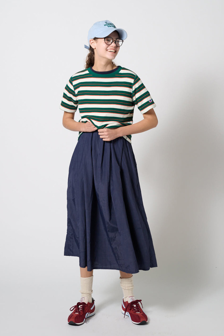 ワンピースのシルエットを生かしたT シャツレイヤード。