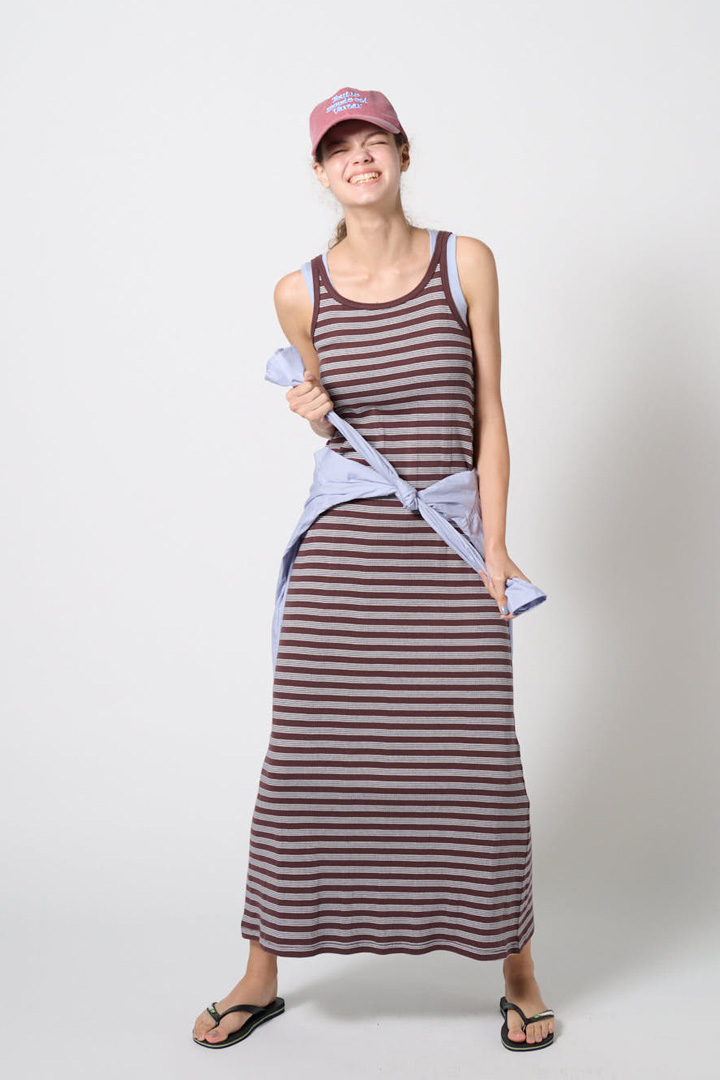 ワンピース¥9900/Robert P.Mille(r シップス インフォメーションセンター)、タンクトップ¥12100 / Soupl eLuz、腰に巻いたシャツ¥37400 / INDIVIDUALIZEDSHIRTS(ともにメイデン・カンパニー)、キャップ¥5940/ VAR ZAR(シップス インフォメーションセンター)、サンダル¥3960 / havaianas(ハワイアナス)