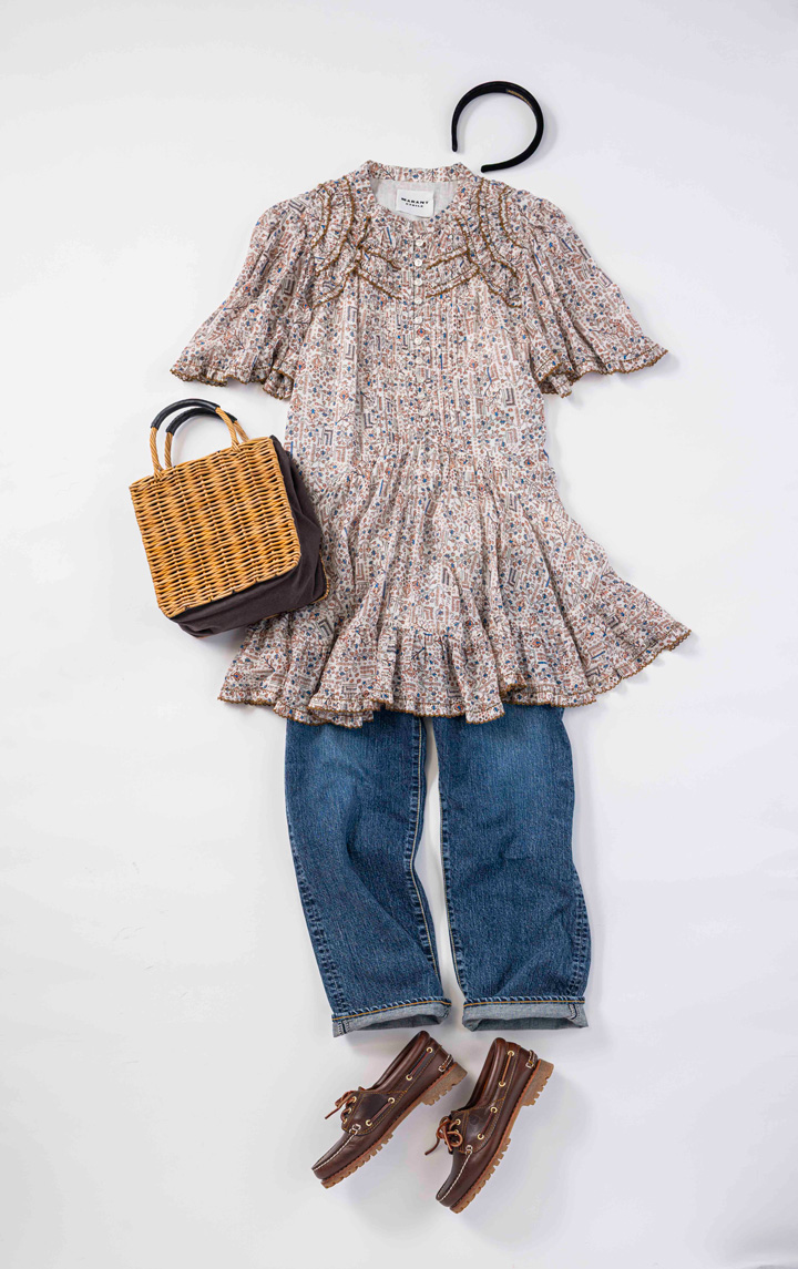ワンピース¥99000 / MARANT ETOILE(イザベル マラン 青山店)、デニムパンツ¥25300 / OMNIGOD(ドミンゴ)、カチューシャ¥26400 / ALEXANDREDE PARIS(アレクサンドル ドゥ パリGINZA SIX店)、バッグ¥39600/LOISIR(ロワズィール)、シューズ¥25300/ Timberland(VF ジャパン)