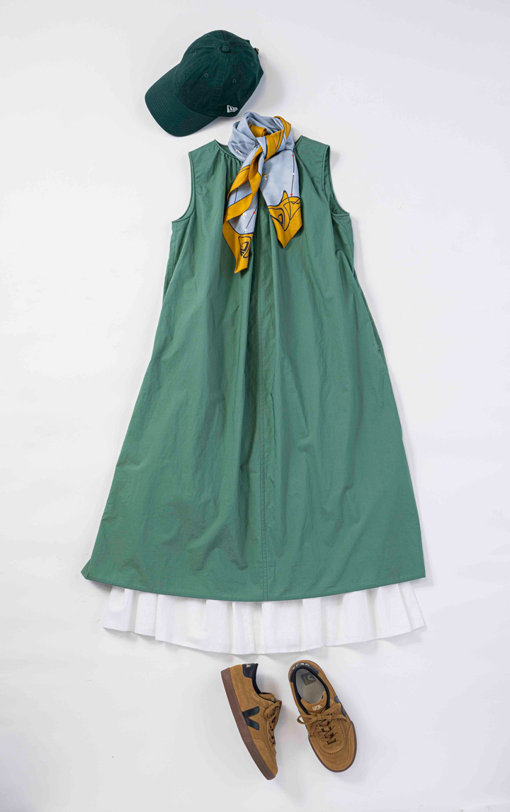 ワンピース¥35200 / Martinique(マルティニーク ルミネ横浜)、スカート¥38500 /ne Quittez pas(パサンド バイ ヌキテパ)、スカーフ¥24200 / A Piece ofChic(グラストンベリーショールーム)、スニーカー¥27599 / VEJA( シードコーポレーション)