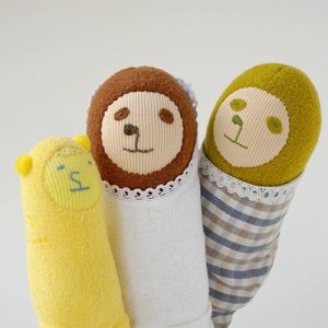 靴下の素材や網目を活かして作られたぬいぐるみたち。モチーフは植物や動物、食べ物など、個性豊かなキャラクターがずらり。ひとつひとつ表情が違うので、会場でお気に入りを見つけてみてください。