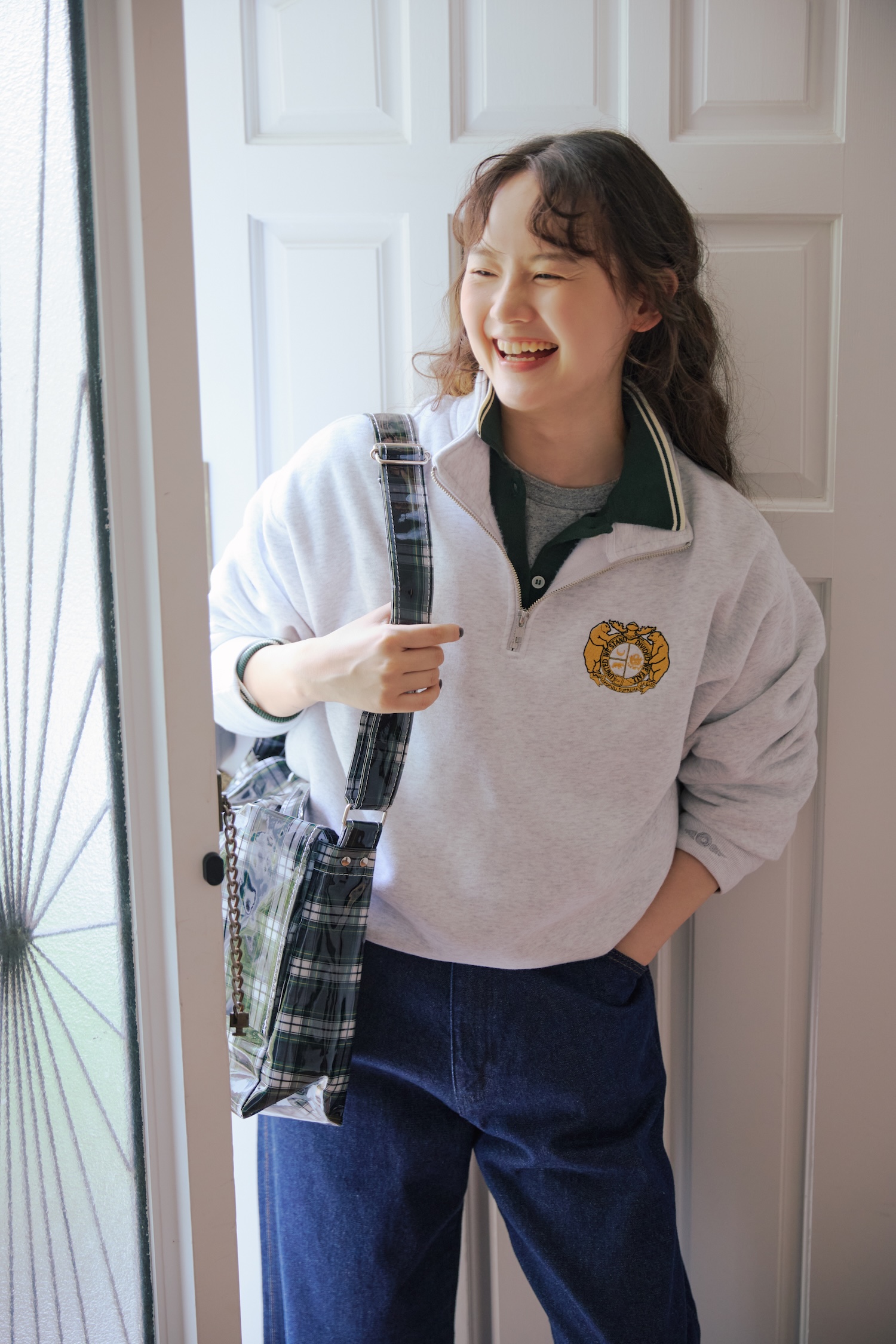 デニムパンツ¥14300/Wrangler(エドウイン・カスタマーサービス)、スウェットシャツ¥18700/BLUESCENTRIC(メイデン・カンパニー)、ポロニットカーディガン¥15950/MidiUmi(マザーズインダストリー)、カットソー¥14300/UpcycleLino BASIC(ネストローブ 渋谷店)、バッグ¥22000/TEMBEA(テンベア トウキョウ)、シューズ¥55000/agnès b.(アニエスべー)