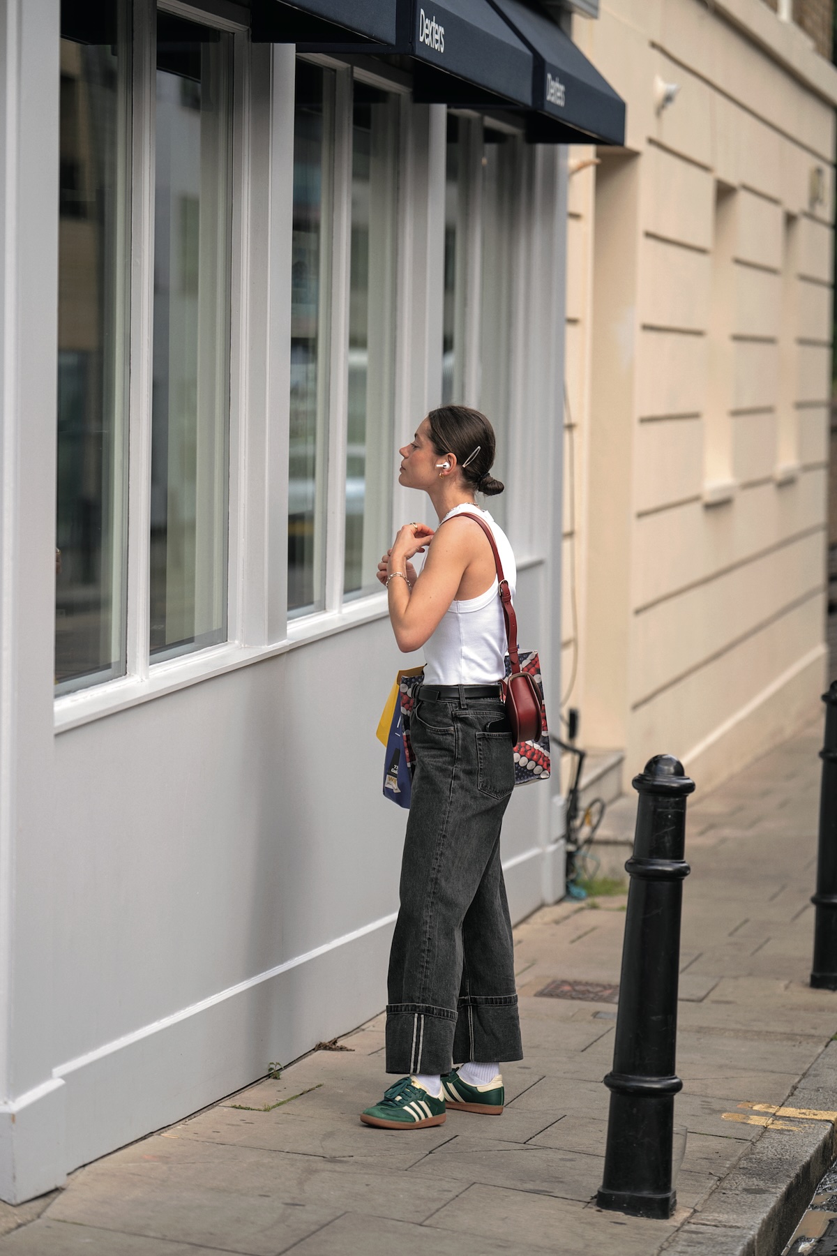 タンクトップ、デニムパンツ/ともにCOS、バッグ/A.P.C.、スニーカー/adidas