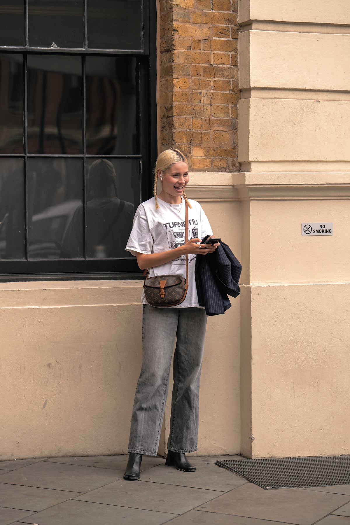 ブラックキャブ待ちのNinaをキャッチ。憧れバンドのTシャツを着て、これからライブの予定なんだそう。そんなカジュアルな装いを、《ルイ・ヴィトン》のバッグでさり気なくクラスアップ!