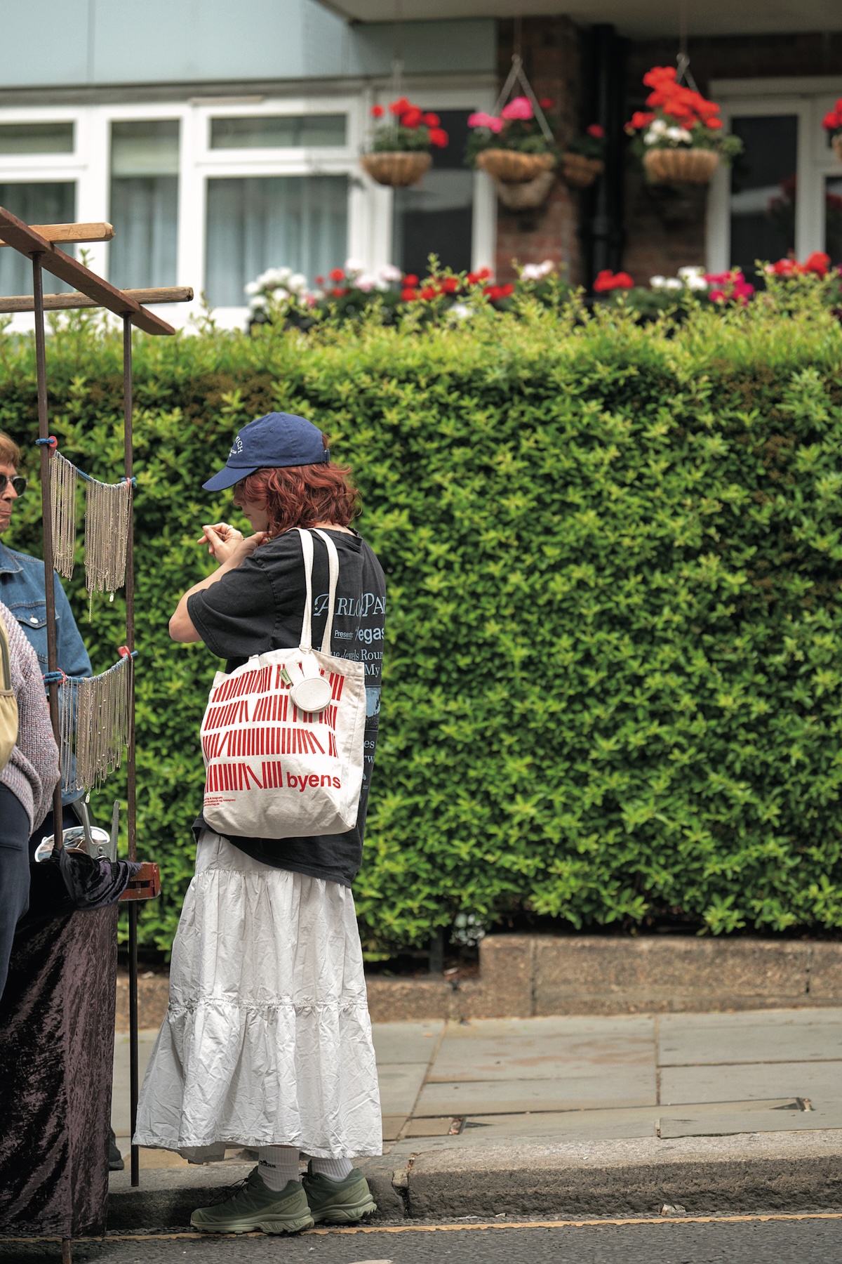 毎週土曜日、イーストロンドンで開かれるブロードウェイ・マーケットは、屋台料理やフルーツ、花、古着など約135のお店が立ち並ぶ、ローカルなお祭り的存在。毎週行列が絶えない人気サンドイッチ店《ディーニーズ》の前で、看板メニューの「マクベス」を友達と半分こして頬張るDottyをパシャリ。今季注目のベストを使ったレイヤードに、ヘアピンを駆使したキュートなヘアアレンジなど、彼女には真似したいテクニックが満載!