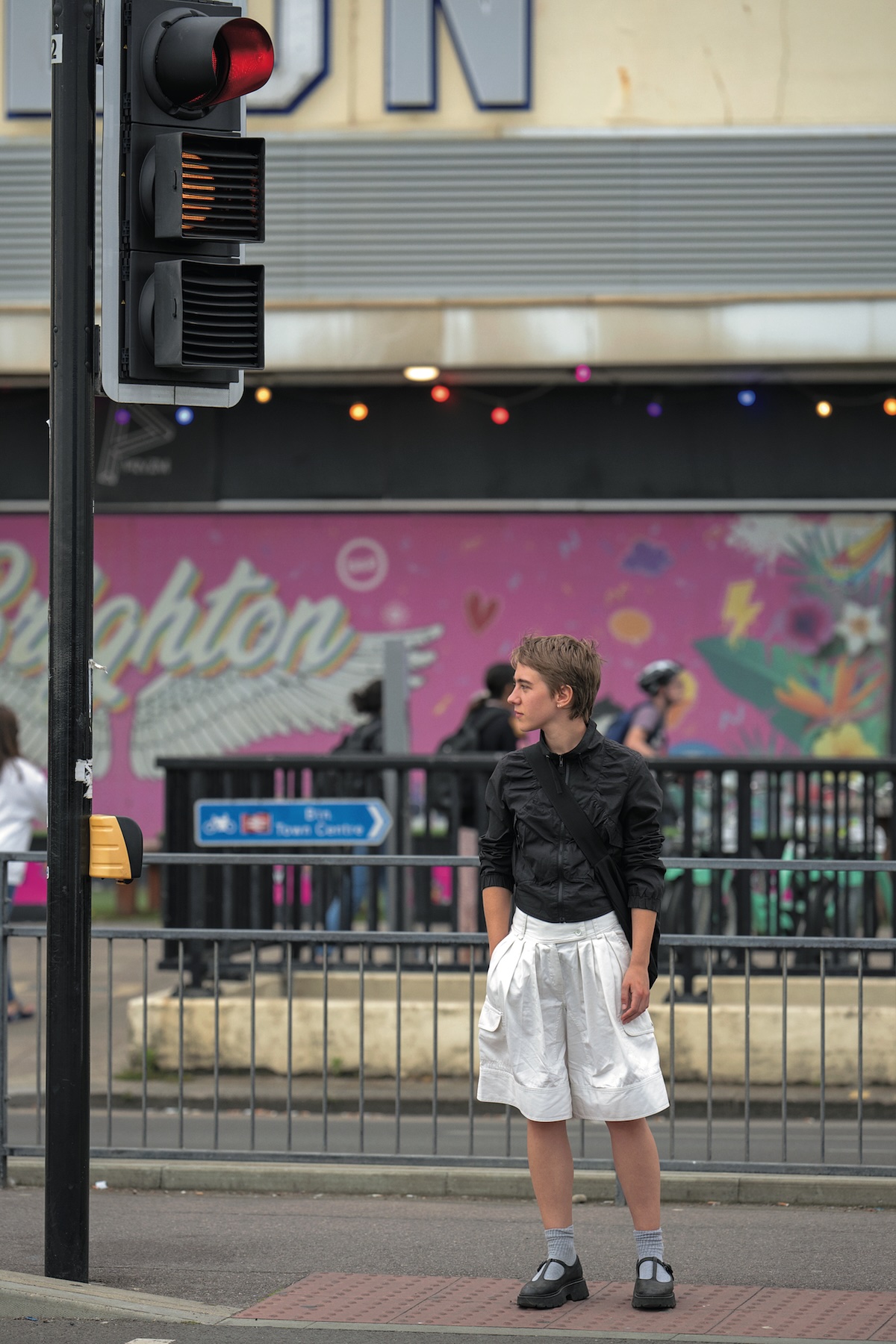 ミニマルなスタイルを、大胆なロールアップや小物の色使いで印象的にする彼女。リップのノリはいい感じ? 、ネックレスはねじれてない?恋人との待ち合わせ前の最終チェックに余念がない様子。