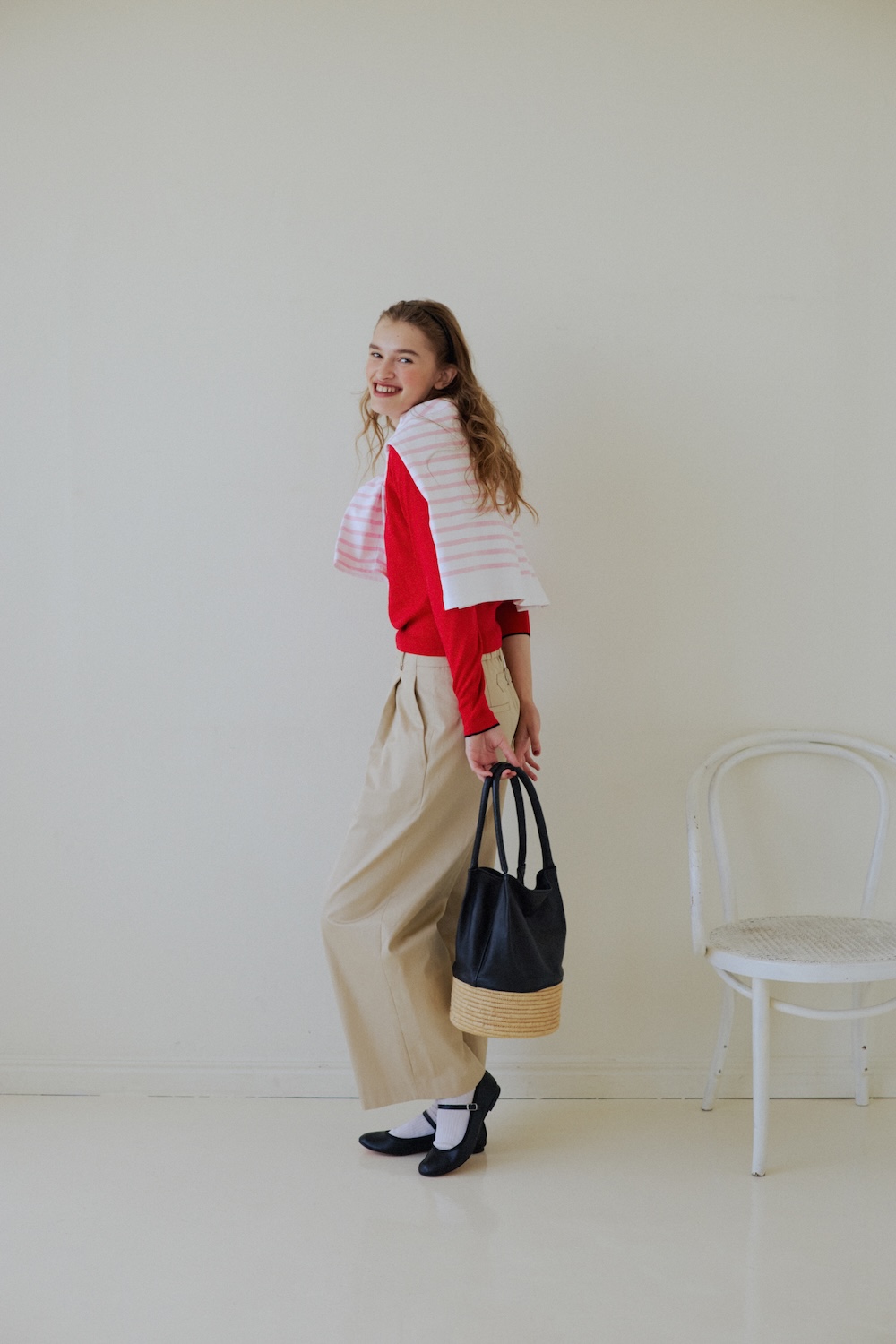 パンツ¥22000/SHIPS(シップス インフォメーションセンター)、ニット¥17600/MACPHEE(トゥモローランド)、肩にかけたカットソー¥19800/Le Minor(ゲストリスト)、バッグ¥17600/KECH LeS ESSENTIELS(ザ エディット ストア)、シューズ¥36300/Catworth(グラストンベリー ショールーム)、ソックス/スタイリスト私物
