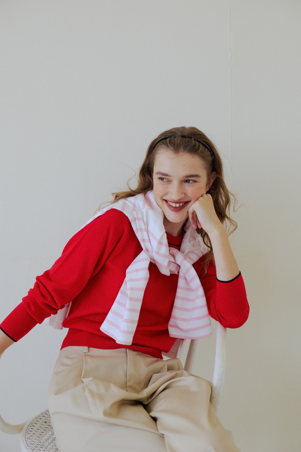 何気ない装いにも華やかさをもたらししてくれる赤ニット。一見派手かも? と思えるドラマティックなカラーもベージュのチノパンが穏やかに受けとめて、品よく知的に着こなせる。仕上げにピンクのボーダーカットソーの肩巻きでラフな甘さを添えれば、チャーミングなフレンチガールスタイルが完成。