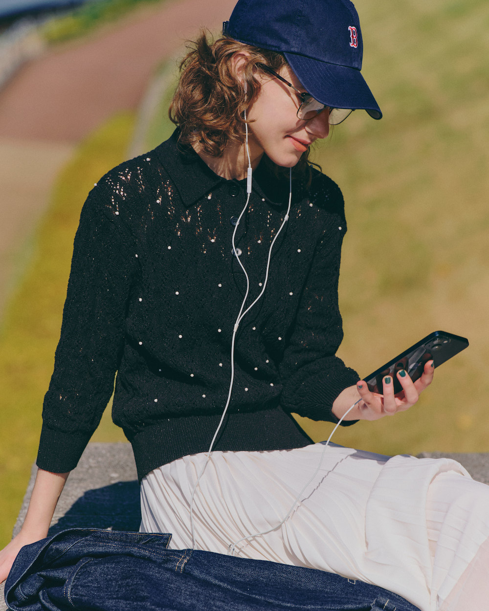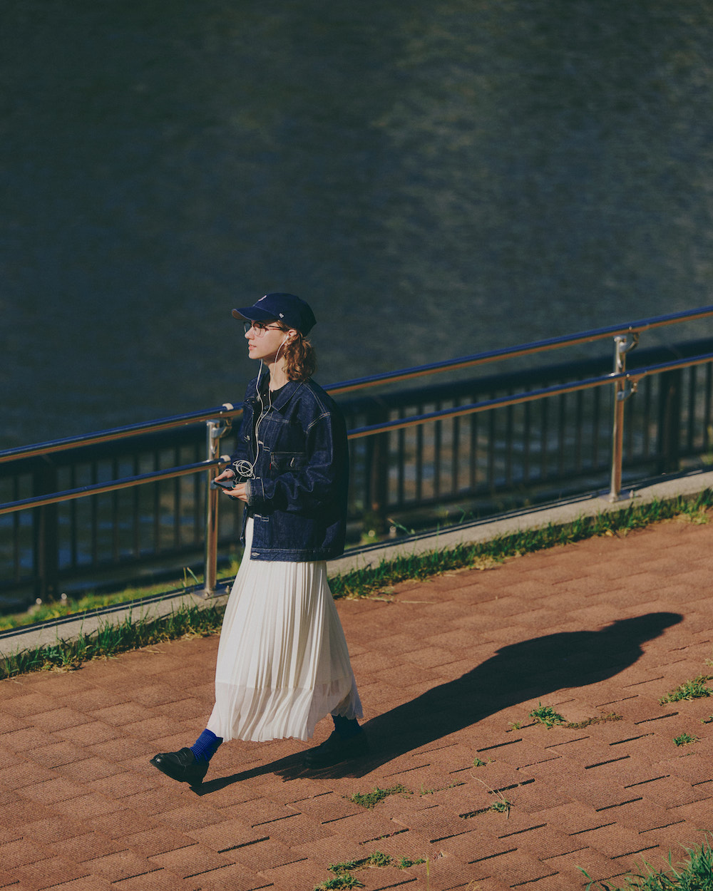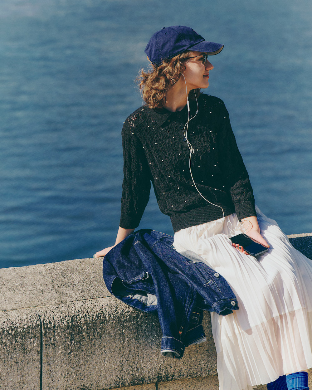 隅田川沿いまでお散歩する日は、リニューアルした《ユナイテッドアローズ》のコーデで。フェイクパールをあしらったニットポロにプリーツスカートを合わせたレディなモノトーンスタイルは、キャップやデニムジャケット、カラーソックスで小粋に外すのが気分。ニットもスカートも、休日はカジュアルに、平日はオフィスカジュアルとしても活躍してくれるから頼もしい。そして駅前のにぎやかさも、川辺の静けさも楽しめる北千住はやっぱり素敵!