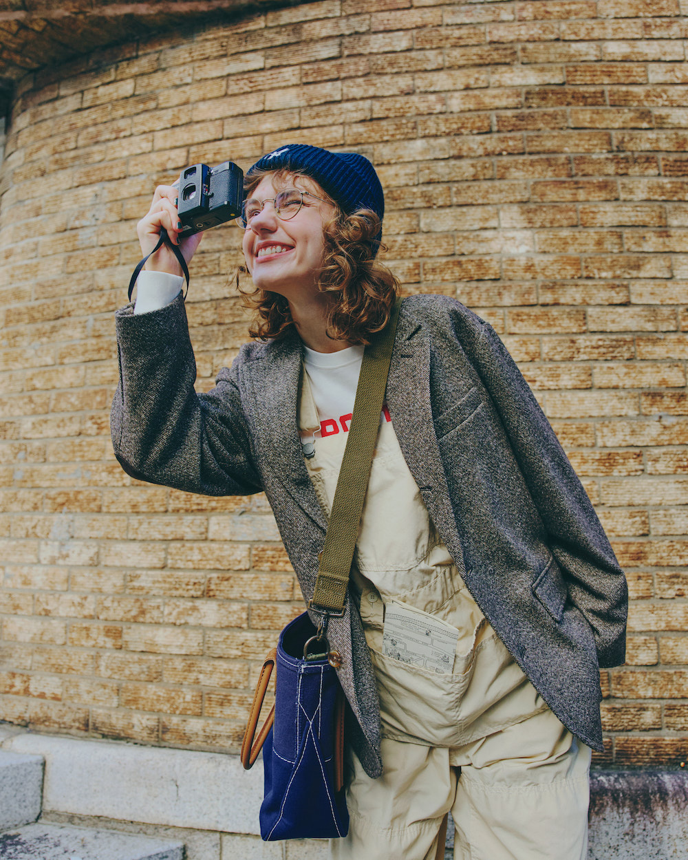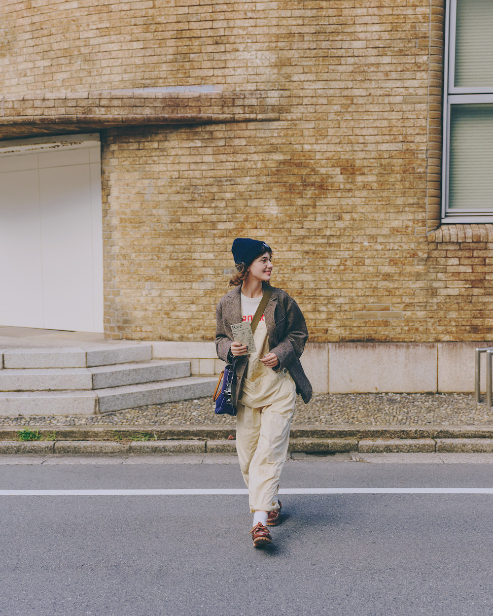 北千住の街を歩いていると、レトロなレンガの建物を発見!ここはヨーロッパ?と思わず足を止めて、写真をパシャリ。この秋お気に入りの《ビームス ボーイ》のツイードジャケットともよくマッチしている。メンズのジャケットをベースにした本格的なディテールを持ちつつ、カジュアルなスタイルにも似合うようゆったりとしたシルエットに仕上げた一枚は、ラフなエプロンオーバーオールとも相性◎。差し色に赤いロゴをチラリと覗かせて、遊び心も忘れずに。
