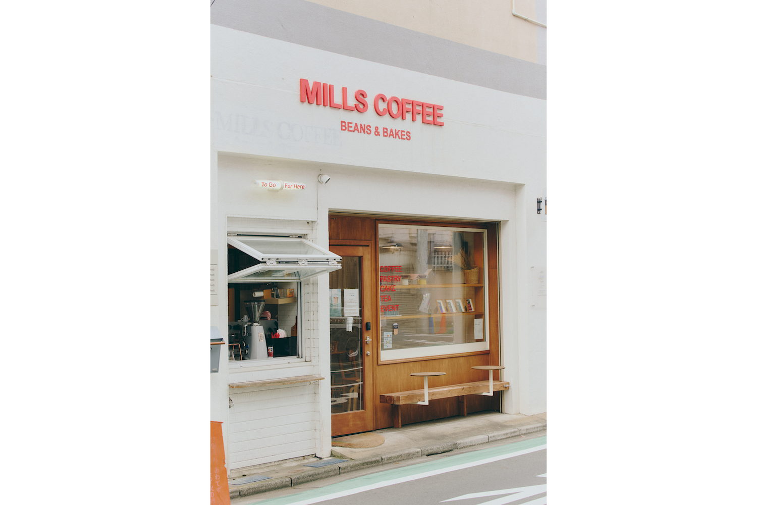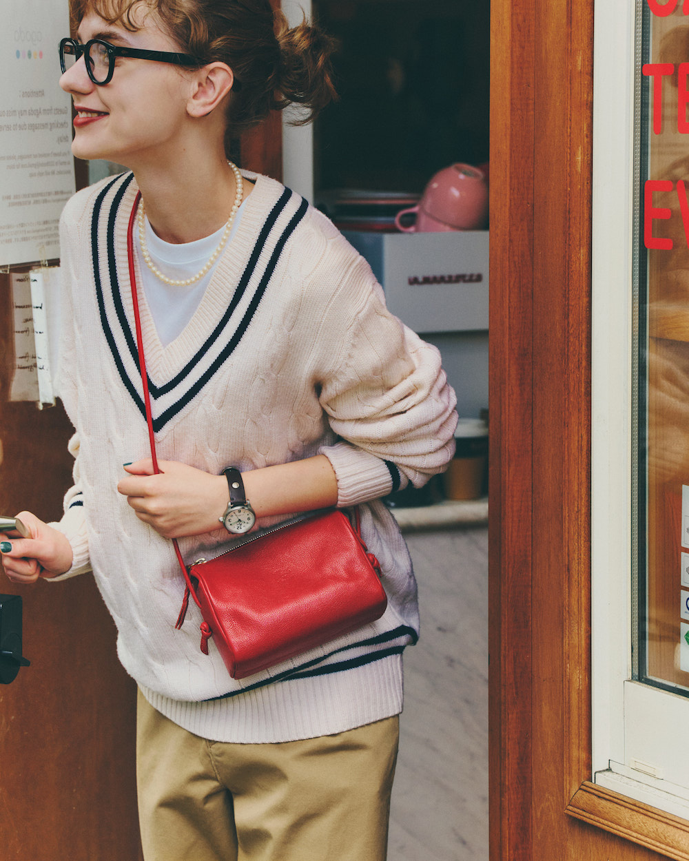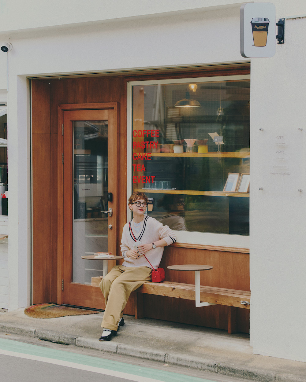 カフェ〈Mills Coffee〉でまったり本とコーヒーの時間。プレッピーな装いに映える赤いバッグは、リニューアルした《イル ビゾンテ》で出会ったクロスボディバッグ。小ぶりな見た目ながらしっかりと収納力のある頼れる存在。パールのネックレスやバレエシューズでレディなムードを盛り上げ、そこに《イル ビゾンテ》の大きめフェイスの腕時計でメンズっぽさをひとさじ。この絶妙なミックス感が可愛い!