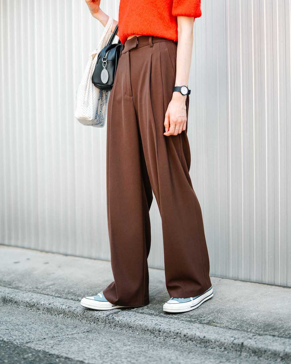ビビッドな朱色のニットとブラウンパンツを組み合わせた秋色タッグで季節先取りコーデに挑戦。深みのあるトーンの装いは、淡い水色スニーカーで抜け感を投影しよう。