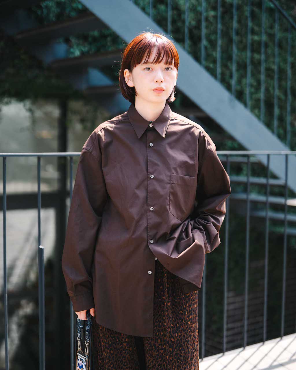 オーバーサイズのシャツとルーズなレオパードボトムを合わせた大人なオールブラウンルック。流行色を大胆に使うことで一気に旬の装いに。引き締め効果のある黒小物も好相性。