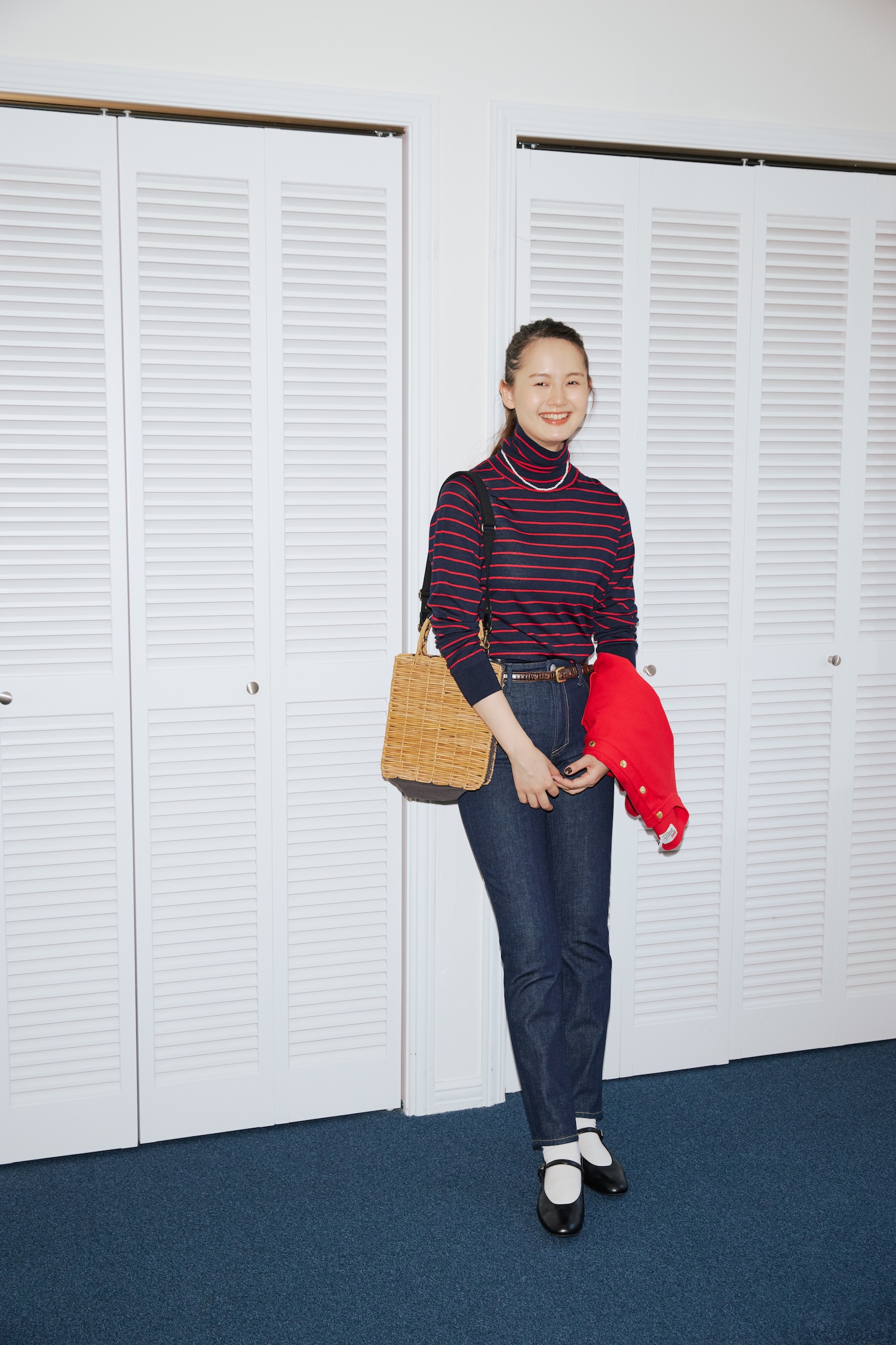 デニムパンツ¥30800/YANUK(カイタックインターナショナル)、タートルネックセーター¥27500、手に持ったジャケット¥31900/ともにTraditional Weatherwear(トラディショナル ウェザーウェア 渋谷店)、ネックレス¥4730 /Danae∴(スス プレス)、バッグ¥39600、ソックス¥2090/ともにLOISIR(ロワズィール)、ベルト¥20900/Scye(マスターピース ショールーム)、シューズ¥22990/MARGARET HOWELL idea(モーダ・クレア)