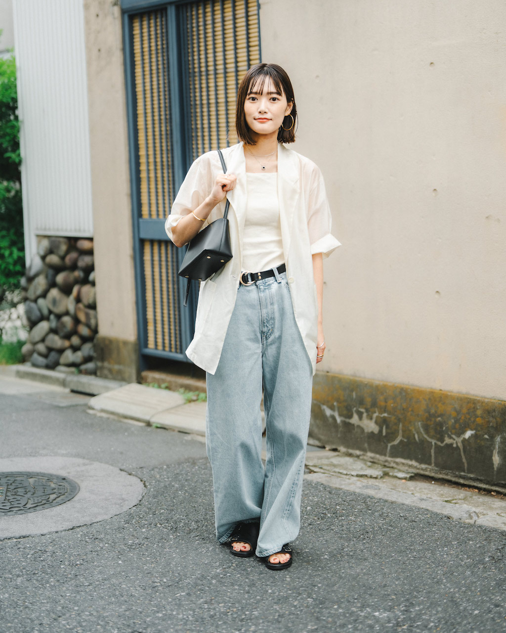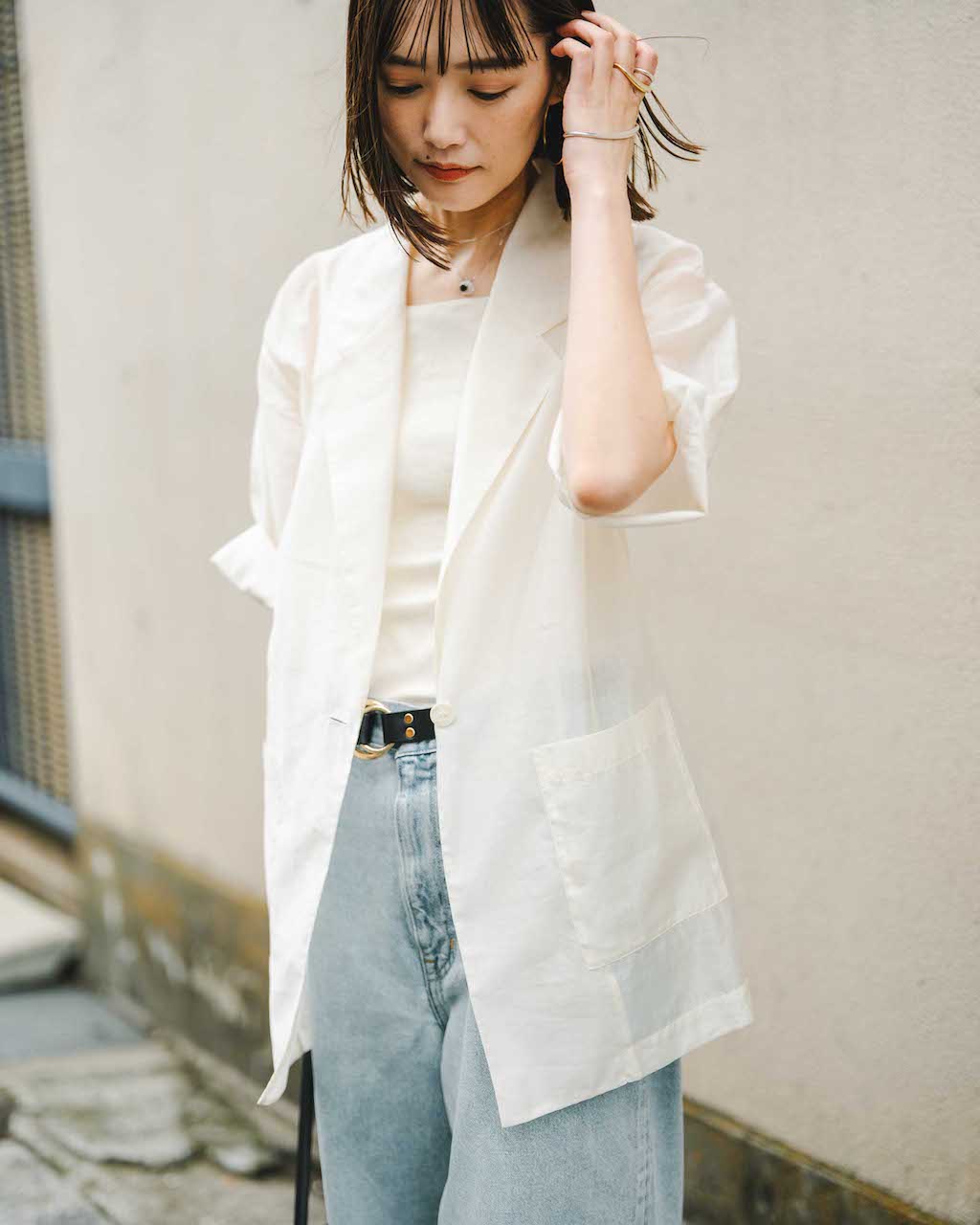 季節感が進むジャケットスタイルは、シアー素材で涼しげにスタート。ライトカラーデニムとホワイトトップスで全身ペールトーンにしつつ、黒小物で引き締めて品よくまとめて。