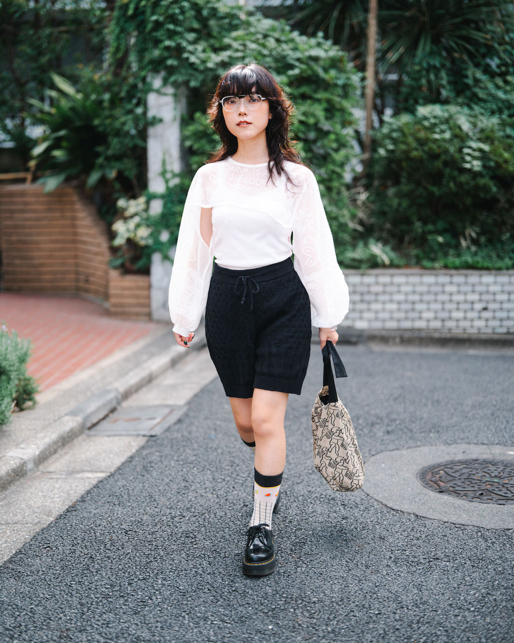 ニットのハーフパンツや繊細なシースルーニットで季節をMIXしたスタイリングに。個性的なアイテム同士を組み合わせつつ、モノトーンカラーでシックにまとめた好例。