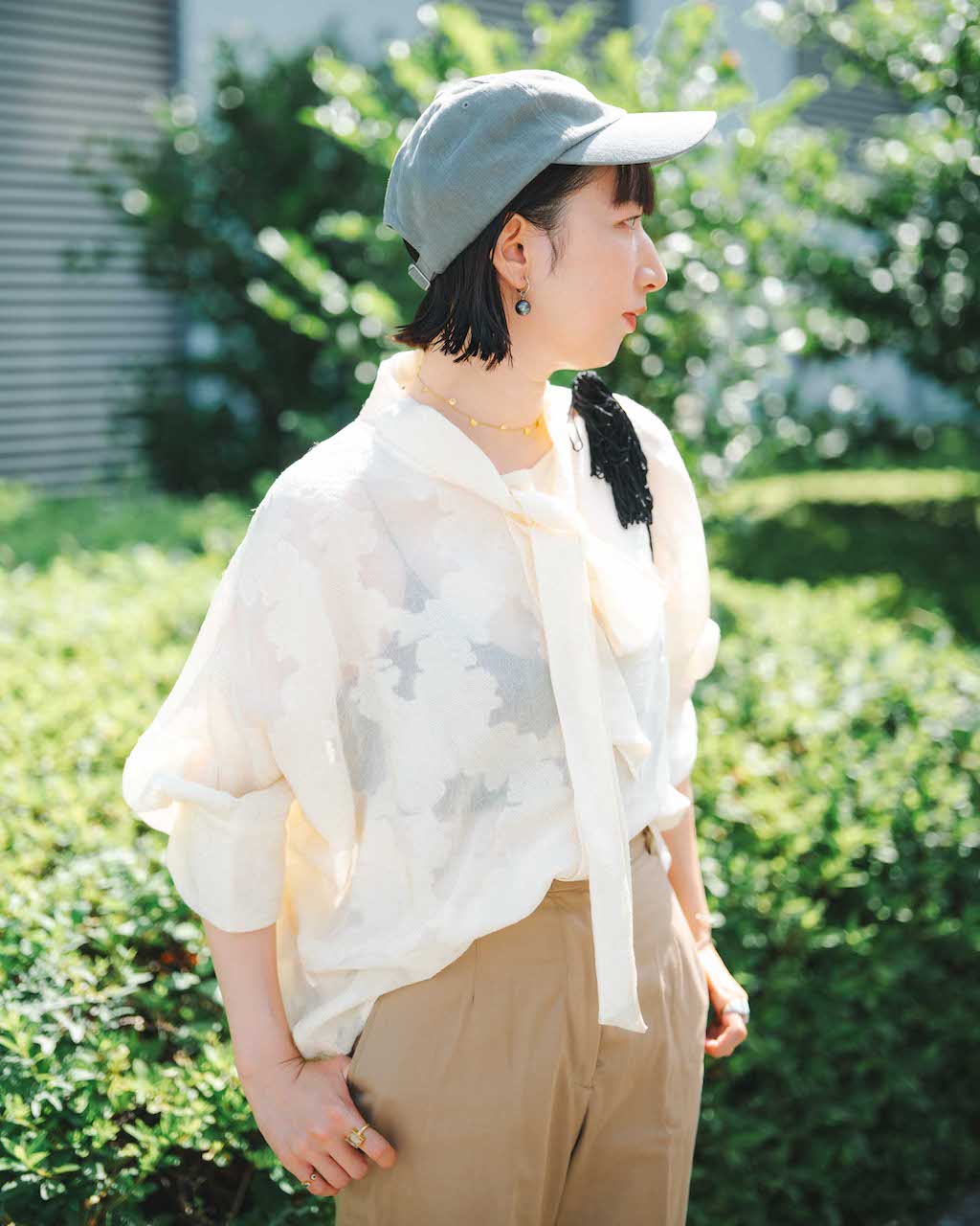 レディライクなシアーブラウスはあえてメンズっぽいチノパンでMIXスタイルに昇華。ボーイッシュなキャップやスニーカーでカジュアルに着こなした大人のデイリースタイル。