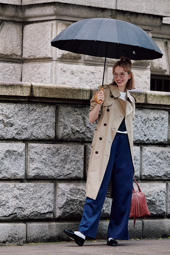 身幅細めのトレンチコートにコンパクトなローファー、上品なレザーバッグのベーシックな着こなしには、ワイドシルエットのトラックパンツがベストパートナー。装いにクリーンな印象を残しつつ、程よくスポーティな抜け感を与えてくれる、とっても便利な1着なのです。