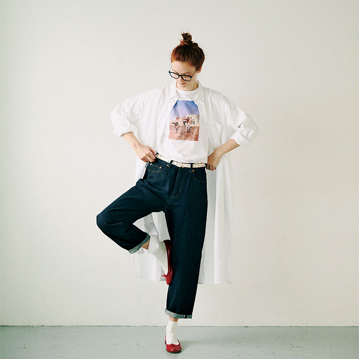 プリントTシャツとデニムパンツの上にラフに羽織るだけでサマになるボーイズライクスタイル。赤のバレリーナシューズで彩りをプラス。