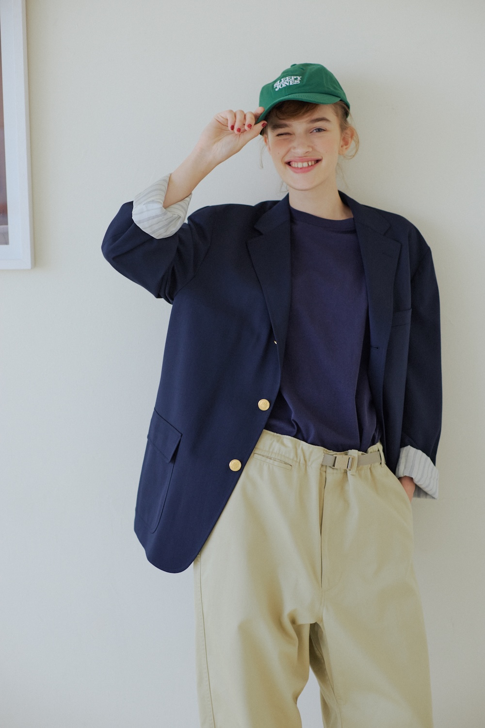 間違いなく決まる「紺ブレとベージュのチノパン」の組み合わせで、安定感のあるアイビールックを楽しみたい。ラフに着こなすなら、ジャケットの袖を軽くロールアップするとこなれ感が出て◎。仕上げにグリーンのキャップでボーイッシュなアクセントを添えれば、トラッドな装いがぐんと鮮やかに。