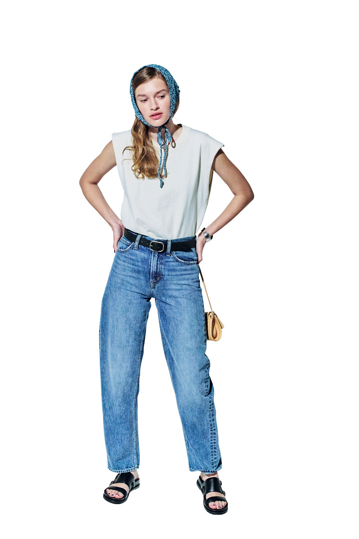 Tシャツ¥13200/SOFT GOODS(メイデン・カンパニー)、デニムパンツ¥7990、ベルト¥2490/ともにGap(ギャップ)、バブーシュカ¥4950/OVERRIDE(オーバーライド 神宮前)、バッグ¥47300/IL BISONTE(ルック D.C事業部)、バングル¥51700/NINA&JULES(ショールーム ロイト)、サンダル¥55000/KATIM(カチム)