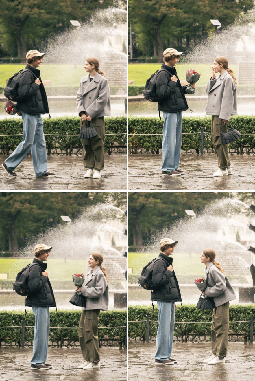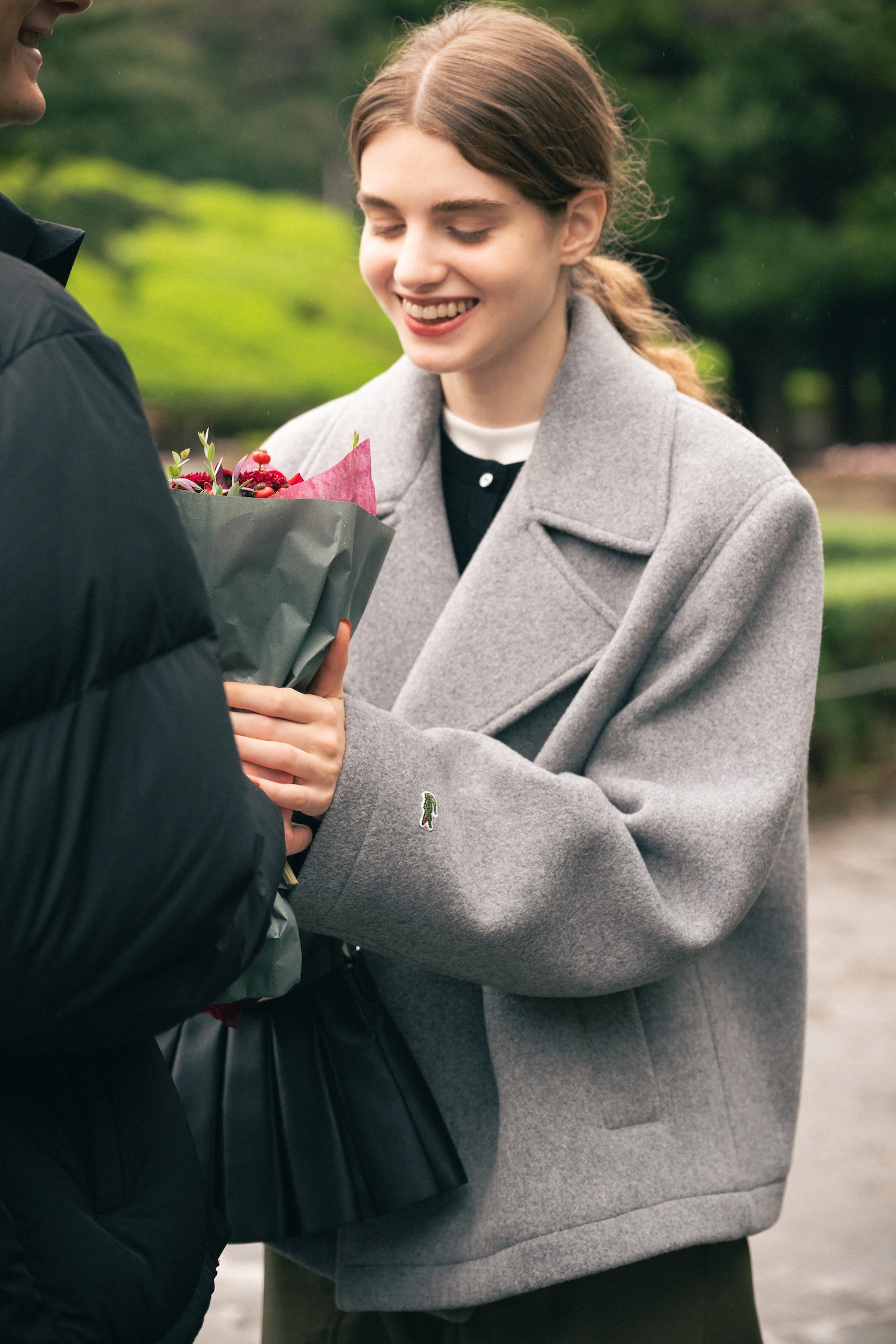 よく訪れる公園で彼を待っていたら、花束のサプライズ!満点の笑顔に、彼も少し照れながら嬉しそうな様子。彼女はショート丈でいて、ほんのりオーバーサイズのPコートがこの冬のお気に入り。ラフなカーゴパンツで、クラシックな表情をモダンに気崩すのが可愛さの秘訣だそう。彼は相棒のダウンジャケットにウォッシュドデニムを合わせて、軽やかな抜け感を演出。