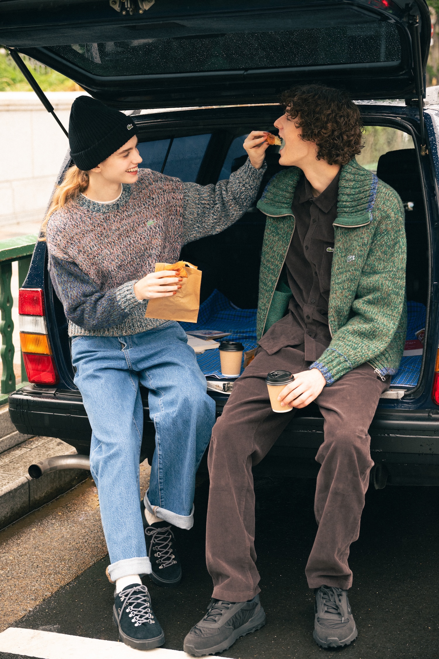 ドライブデートが好きなふたりは、のんびりトランクで朝食を食べながら目的地を決めるのがお決まり。曇り空を明るく吹き飛ばすように、装いをプレイフルに彩るミックスカラーセーターでリンク感を意識したみたい。彼女はデニムパンツやニット帽を合わせてカジュアルに、彼はセットアップの上に羽織って、思い思いに着こなしを謳歌。
