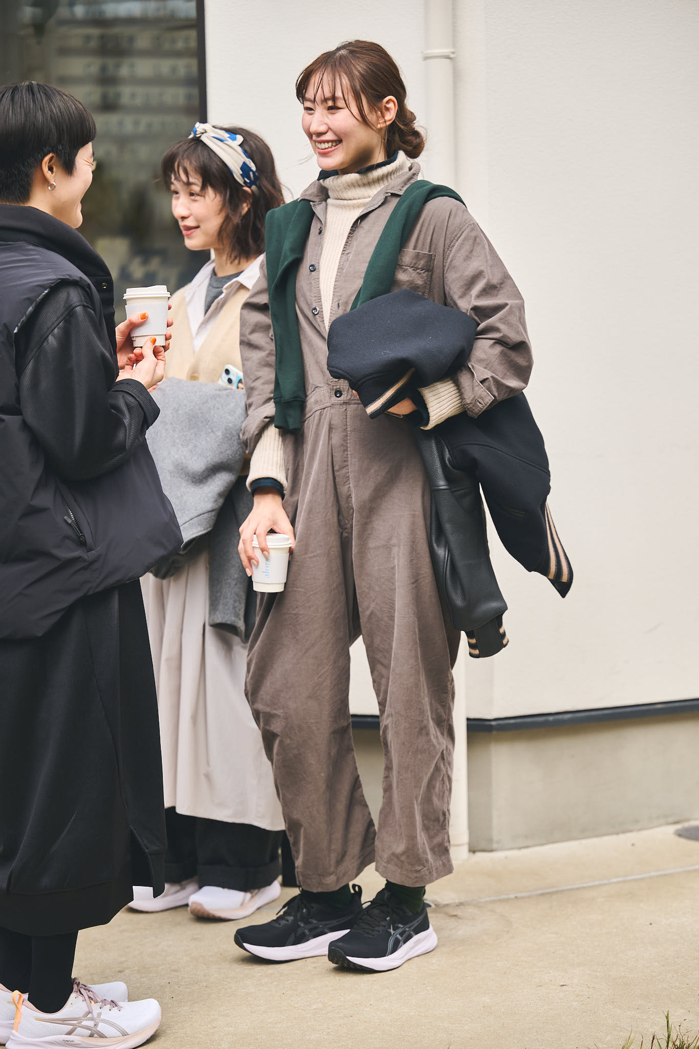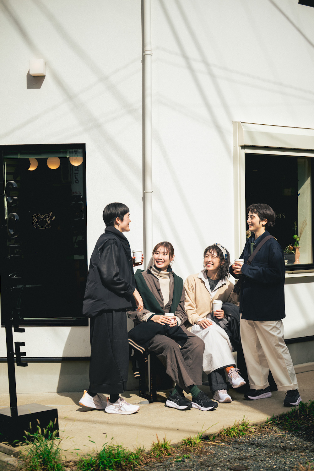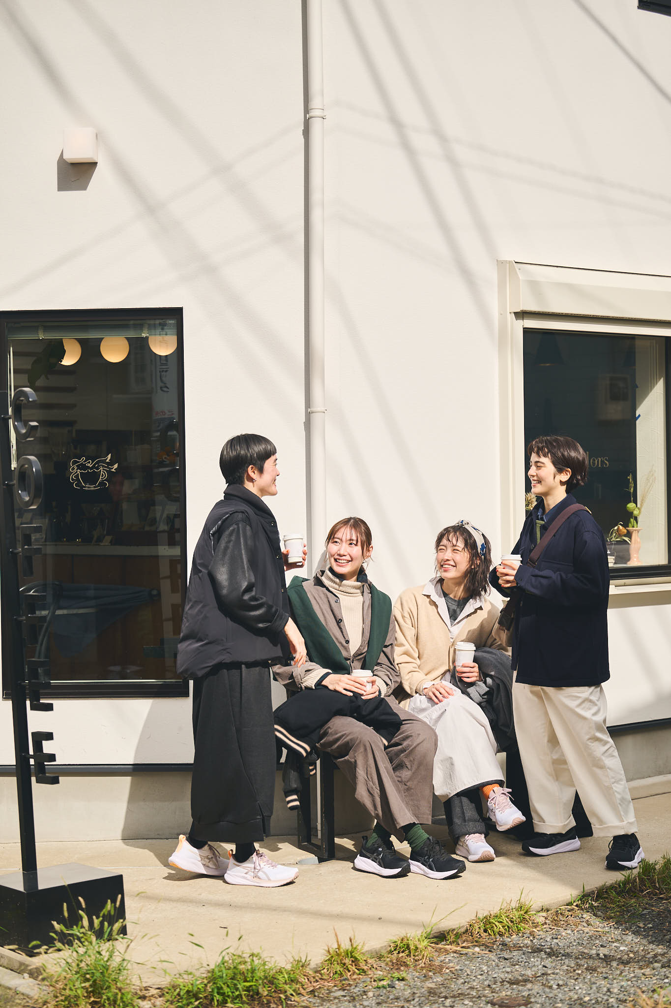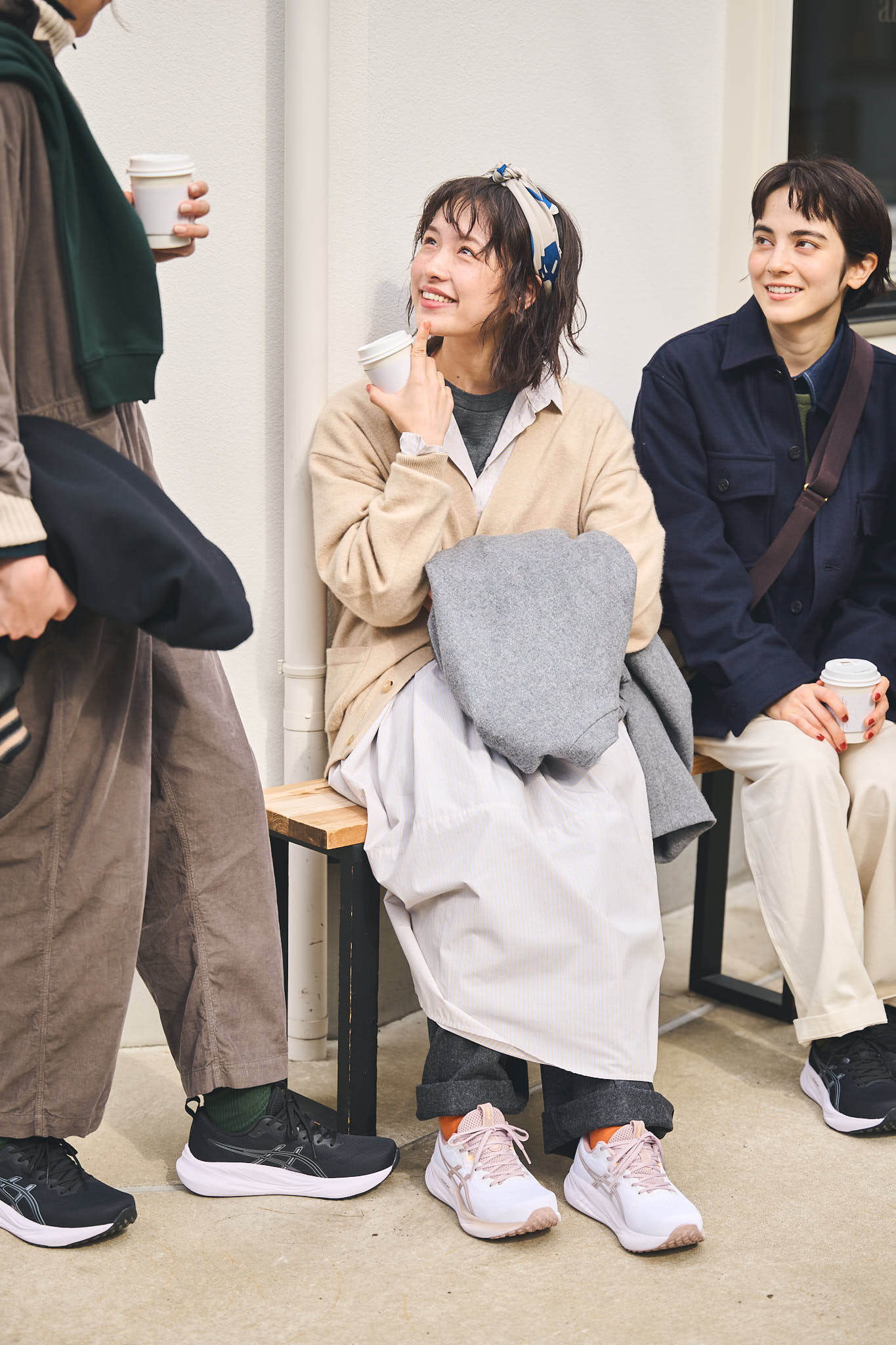 行きつけのカフェでばったり再会した4人。「えっ、今日もお揃い!?」と笑い合う足元には、やっぱりGEL-PULSE 16。それぞれのふだんのコーディネートにしっくり馴染んでいて、その対応力を改めて実感。