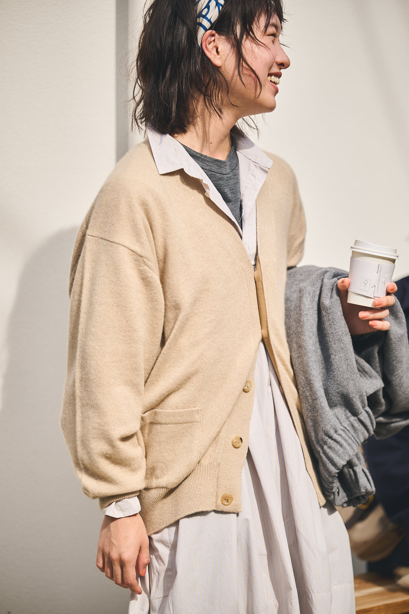 シューズ¥13200/ASICS(アシックスジャパン)、カーディガン¥91300/HERILL(にしのや)、シャツワンピース¥46200、プルオーバー¥17600、手に持ったジャケット¥46200/以上すべてVéritécoeur(ヴェリテクール)、パンツ¥42900/ANATOMICA(アナトミカ 東京)、スカーフ¥27500/A Piece of Chic(グラストンベリー ショールーム)
