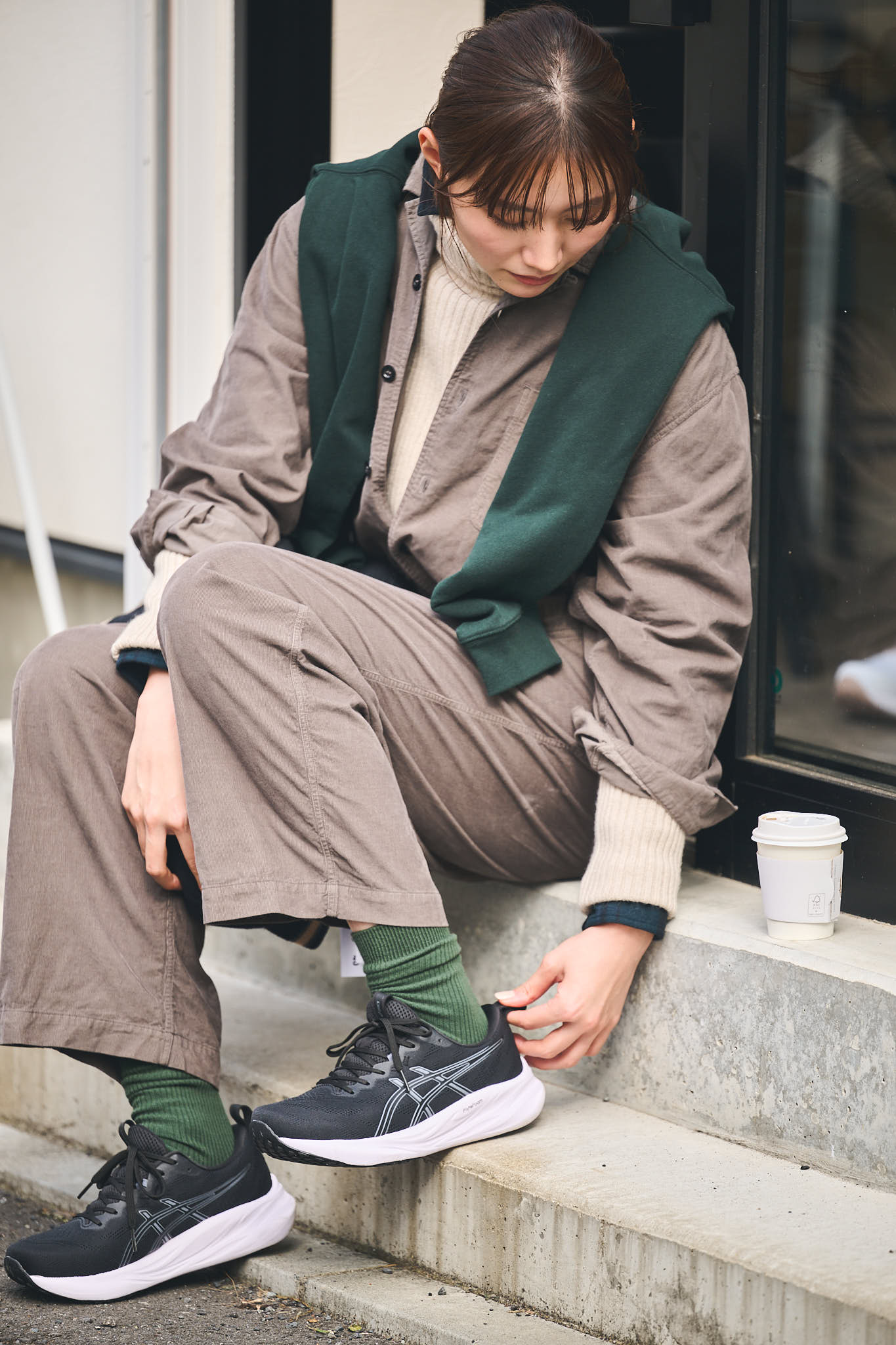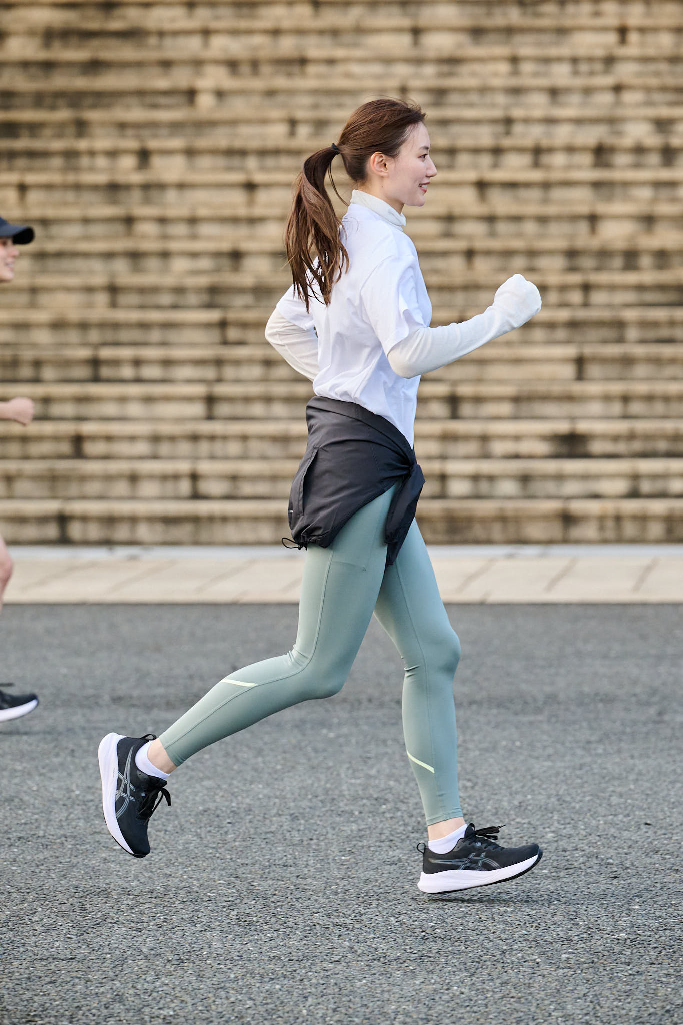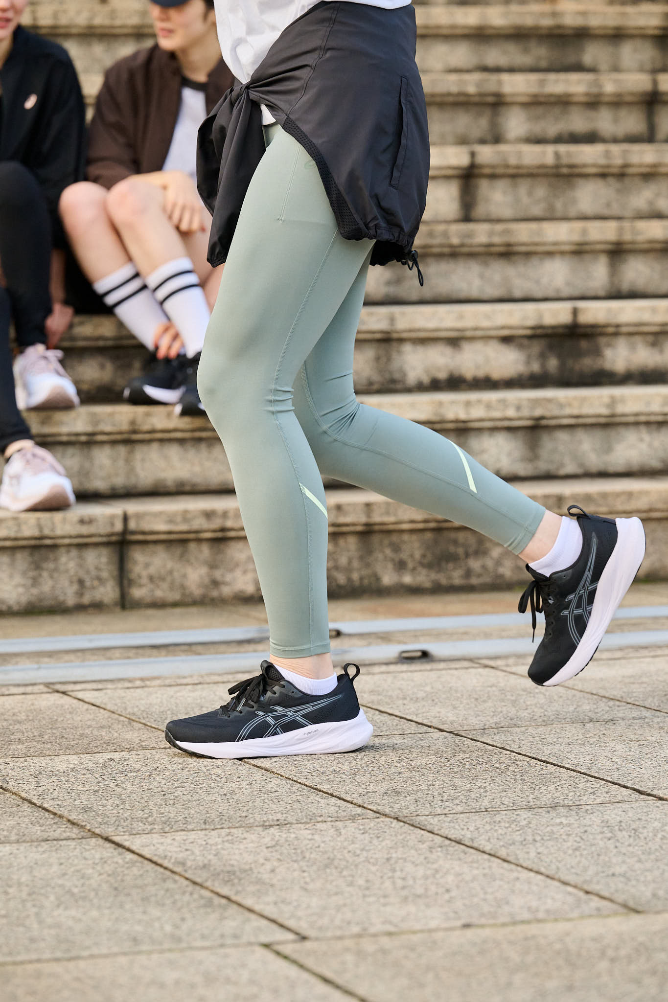RAN「お気に入りのモスグリーンのタイツを、モノトーンのGEL-PULSE 16でキュッと引き締めました。さらにシューズとリンクした黒のジャケットを腰巻きして、スポーツで鍛えた足腰をカバー。下半身をスマートに見せたい方におすすめです」