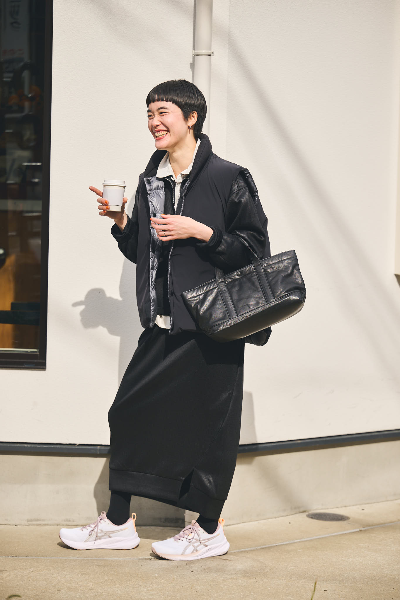 シューズ¥13200/ASICS(アシックスジャパン)、ベスト¥88000、バッグ¥42900/ともにScye(マスターピースショールーム)、ジップアップジャケット¥35200、サイドスリットスカート¥24200/ともにALWEL(グラストンベリー ショールーム)、シャツ¥28600/Véritécoeur(ヴェリテクール)