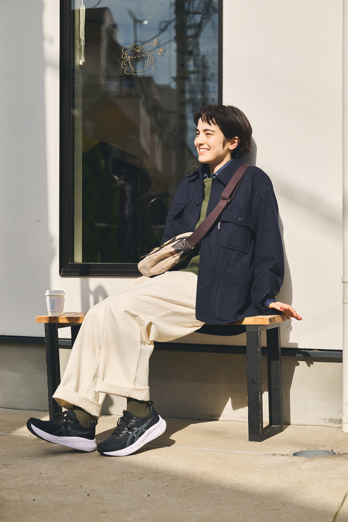 シューズ¥13200/ASICS(アシックスジャパン)、ジャケット¥34100、中に着たシャツ¥27500/ともにBLUE BLUE、セーター¥26400/HOLLYWOOD RANCH MARKET(以上すべてハリウッド ランチ マーケット)、パンツ¥22000/HTS、バッグ¥37400/QUALITY GUNSLIPS(ともにビューカリック&フロリック)