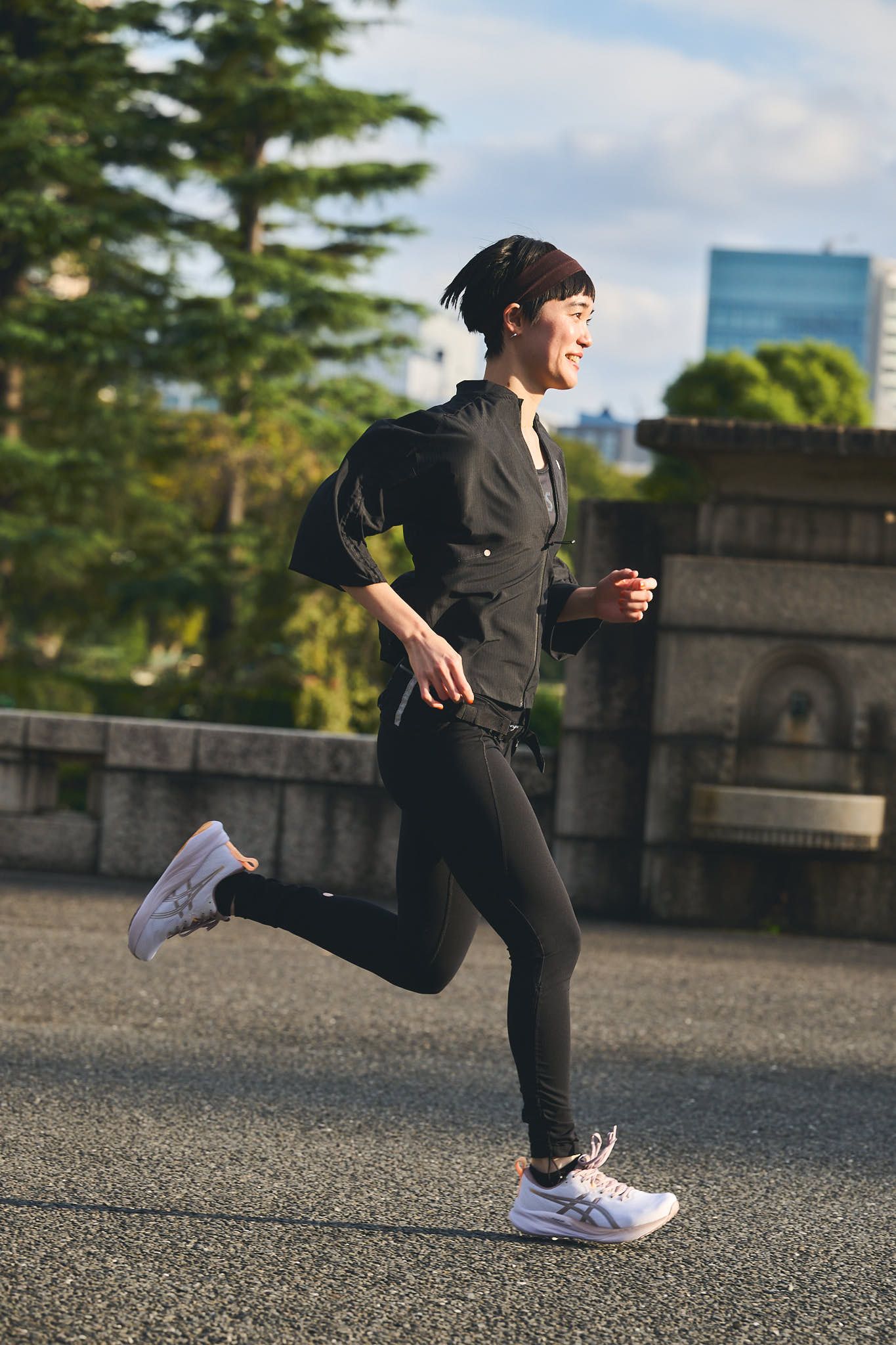 桜子「ブラックでまとめたストイックなランニングスタイルに、淡いカラーのGEL-PULSE 16をオン。コーディネートにぐっと抜け感を与えてくれます。一見シンプルですが、ウエストポーチやヘアバンドなど小物使いもひと工夫」