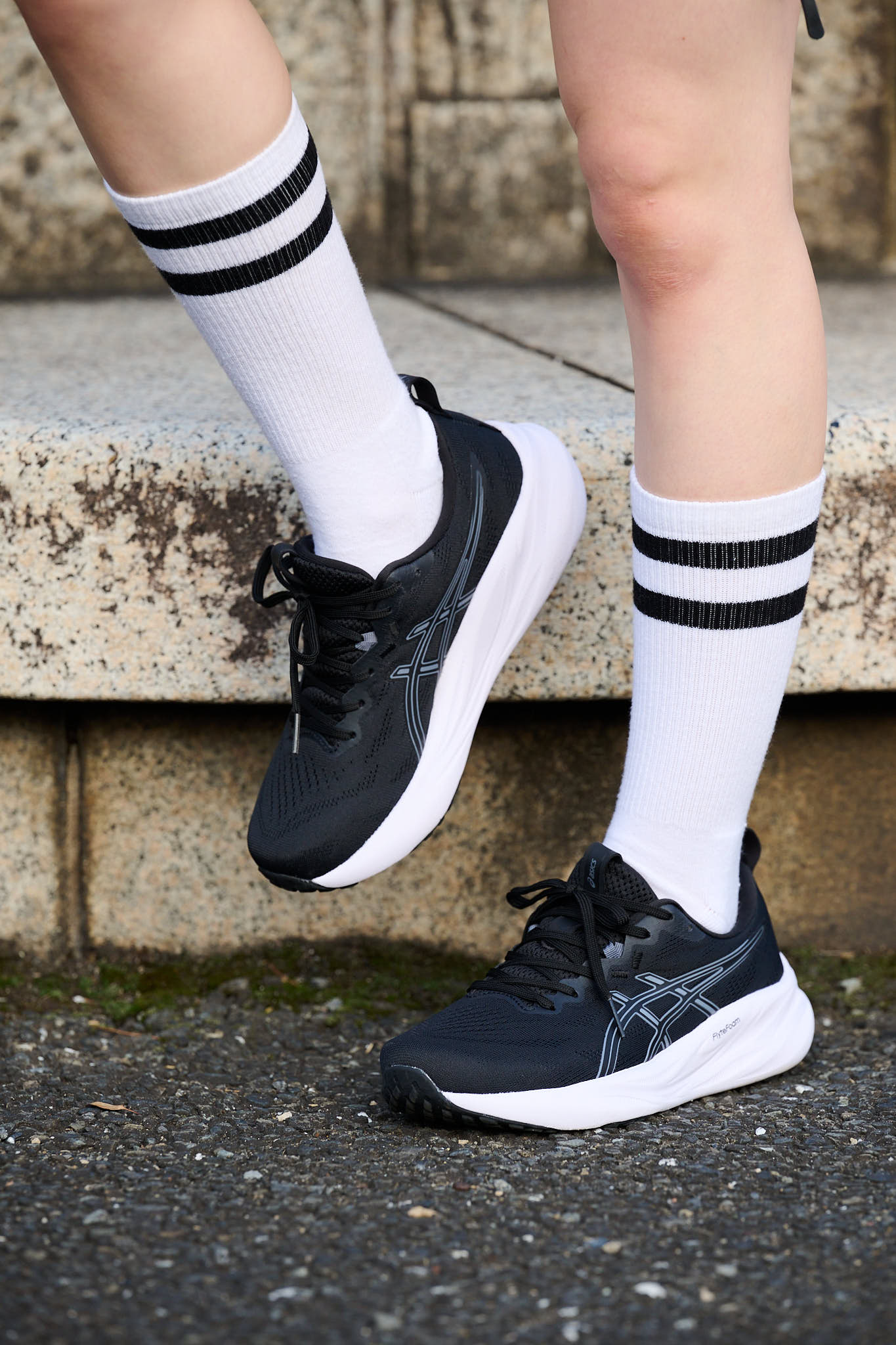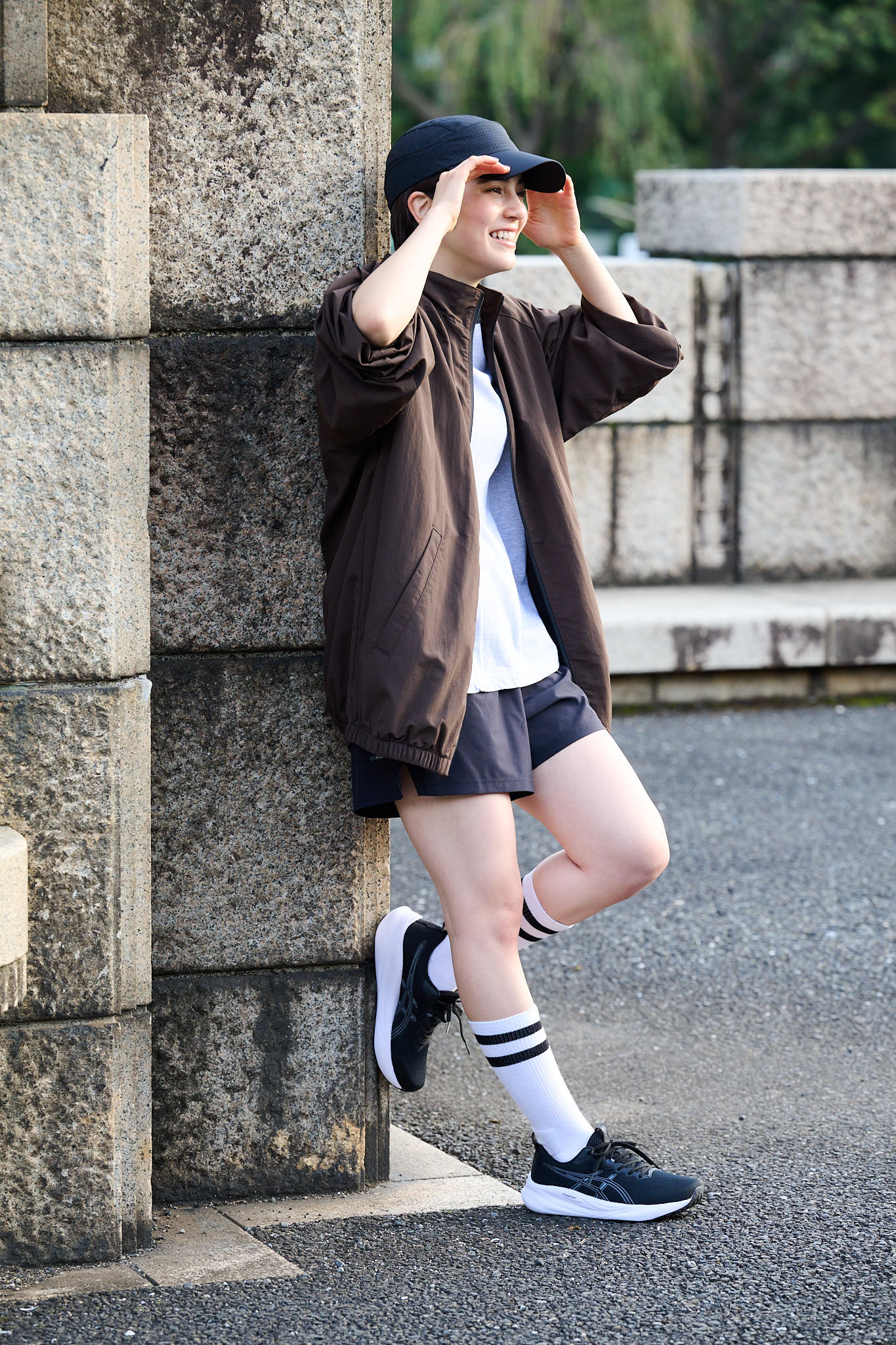 ジュリアンヌ「モノトーンでまとめたランスタイルに、同系色のGEL-PULSE 16を合わせました。程よくボリュームのある足元が、ショートパンツとのバランス◎。ブラウンのジャケットを羽織って今っぽさも取り入れて」