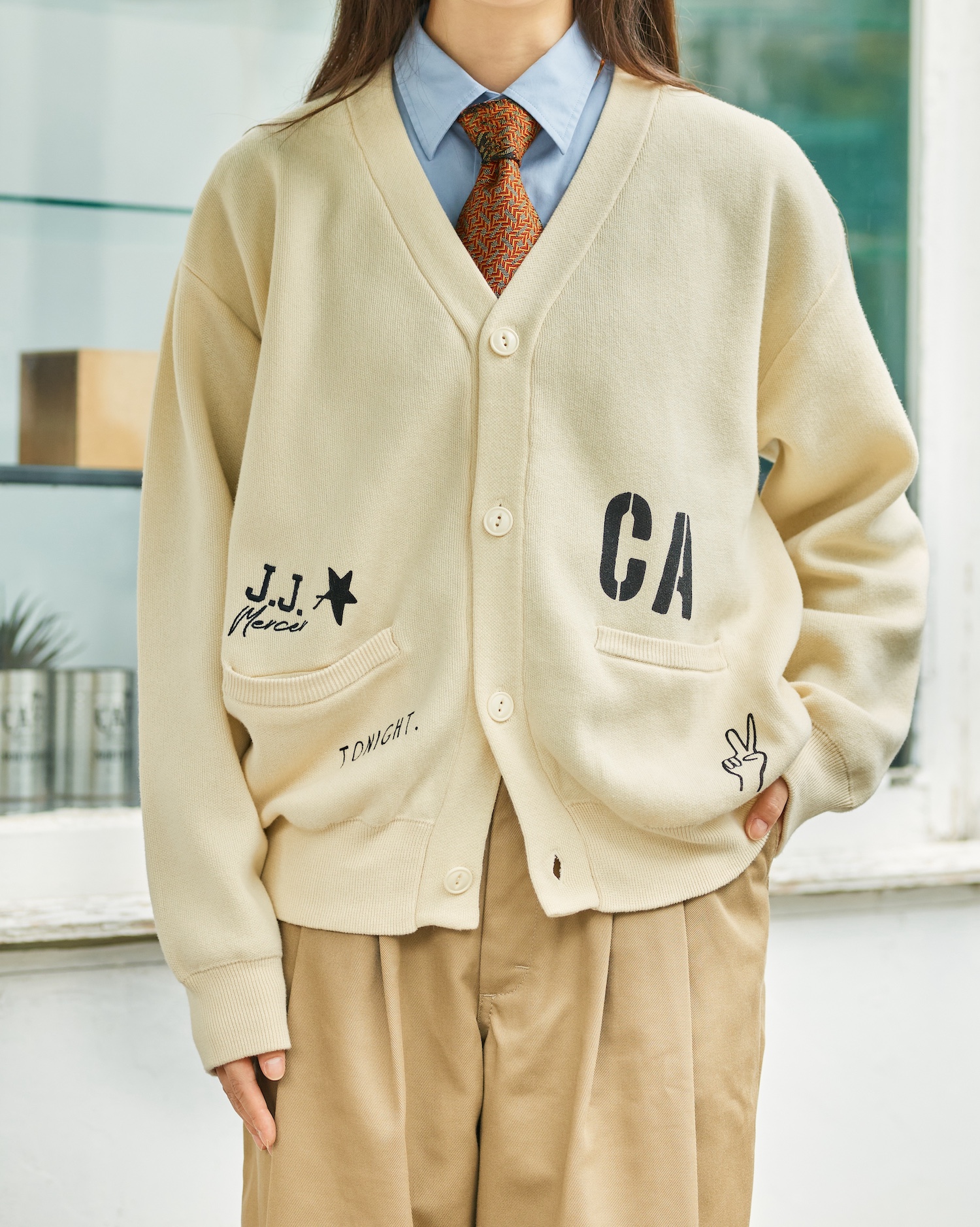 前後にあしらわれたグラフィックデザインで、おしゃれに差がつくニットカーディガン。旅先のライブ感を感じるハッピーなモチーフで、着るだけでポジティブな気持ちで過ごせそう。ゆったりシルエットとドロップショルダーで、こなれ感のある着こなしに。