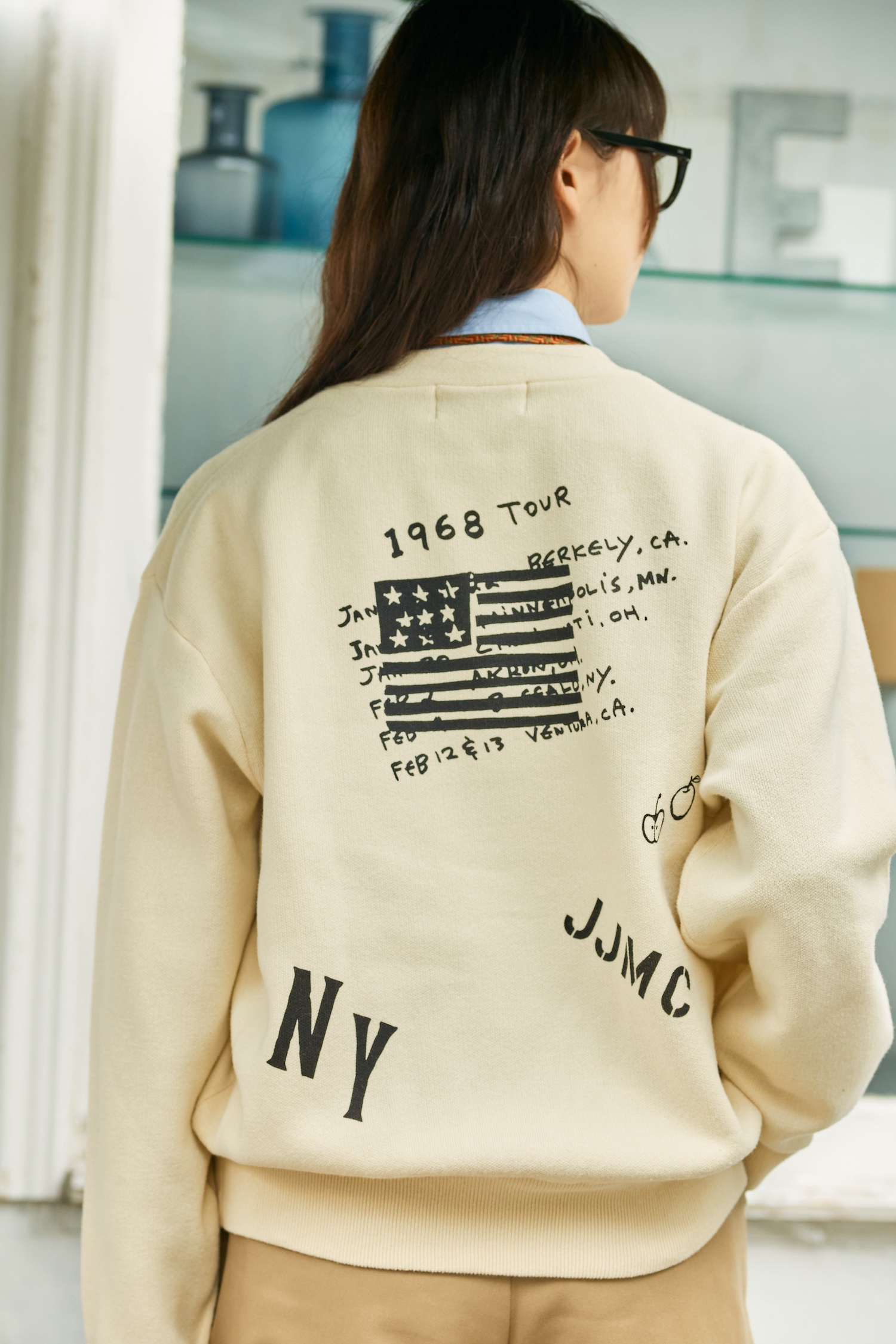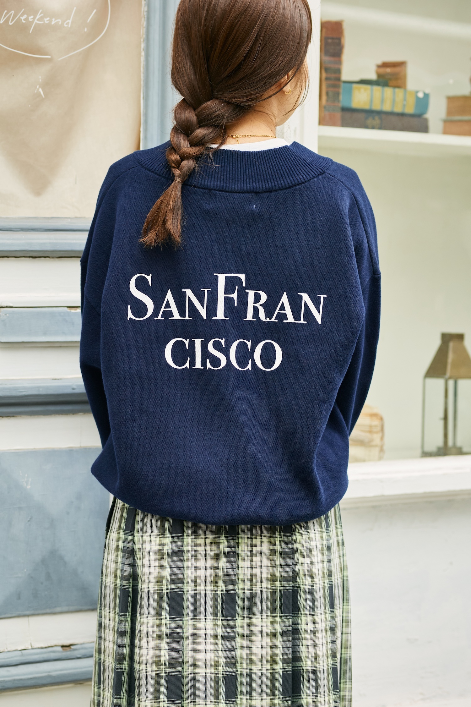 深く入ったVネックのニットで女性らしく着こなせる一枚。ニットの編地でスウェット見えを表現。スウェットのカジュアルさとニットの上品さを兼ね合わせているので、デニムからスカートまでさまざまなボトムスと相性抜群です。胸元にはロゴ、バックプリントにはサンフランシスコのロゴが描かれ、60年代を表現したレトロなデザインが今の気分にフィット。