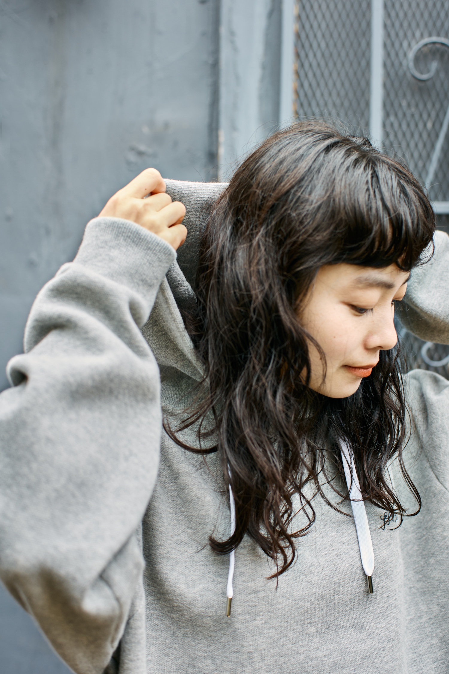 ボリュームのあるシルエットで、リラックスして着られるロゴフーディー。FUDGE FRIENDの田中さんはショートパンツを合わせて、抜け感のあるこなれた大人の雰囲気の着こなしに。足元は黒のスニーカーで引き締め、ソックスはショートパンツと色合わせするなどさりげない小技を効かせて。存在感のあるフードやゆるっとした袖のバランスが、横から見たときの印象も素敵に演出してくれます。