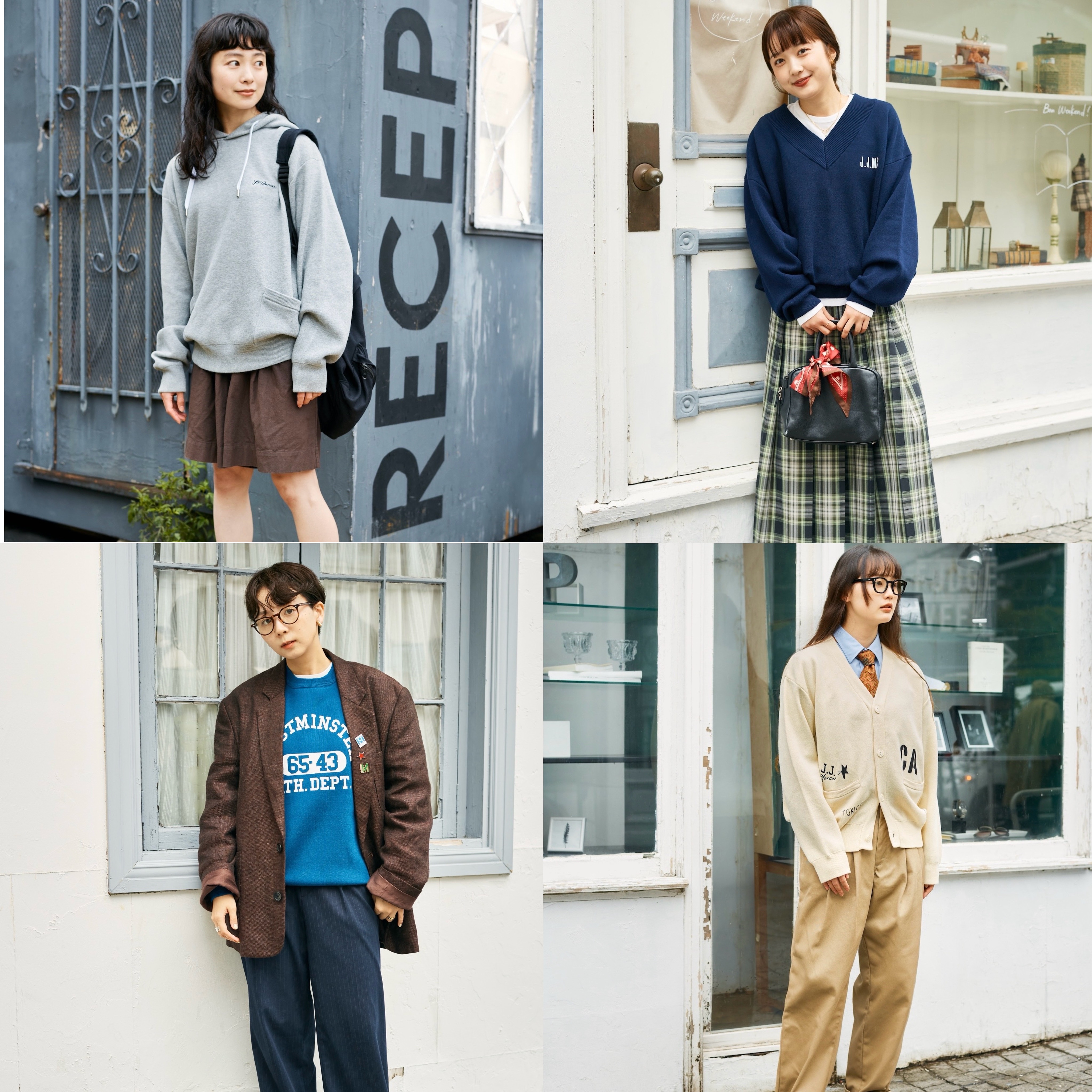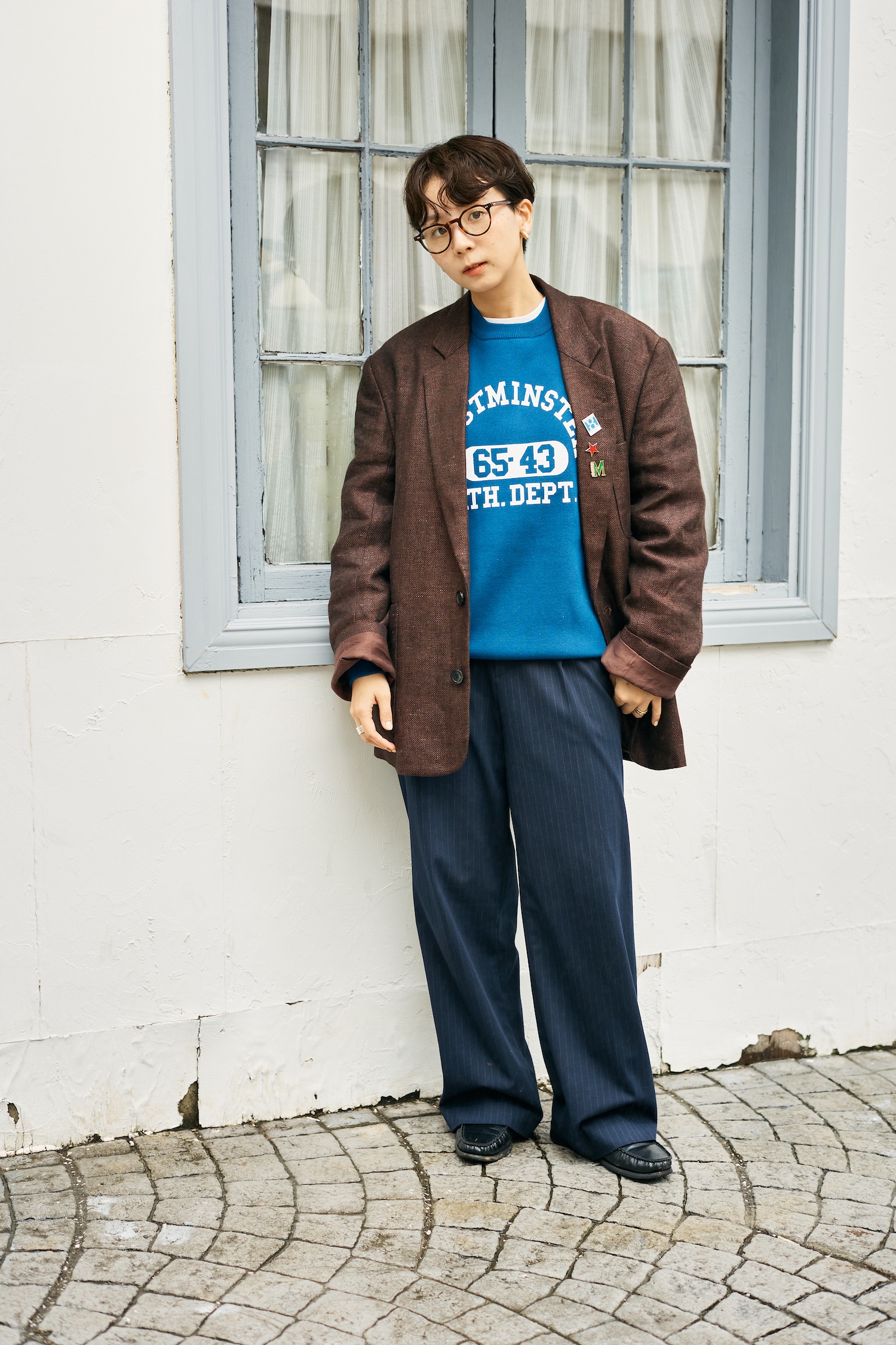 FUDGENA のkinokoさんはカレッジ風のプリントニットにキレイめなスラックスを合わせて王道のアイビースタイルに。パッと目を引く爽やかなブルーに、トレンドのブラウンのジャケットを合わせると秋らしいおしゃれな配色の完成!ジャケットにつけたピンバッチで抜け感と遊び心をプラスして。絶妙な首元の詰まり具合のクルーネックは、インした白Tが見える分量もgood。
