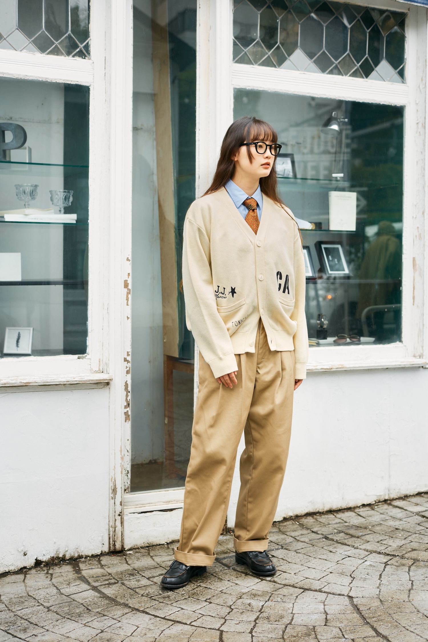 FUDGE FRIENDのうさみさんはこなれ感のあるカーデを主役に、ブルーシャツとネクタイを合わせてスクール風にコーディネート。秋口から長い使えて便利なコットンニットカーディガンは、前後にキャッチーなグラフィックが。装いのアクセントとなる主役級のカーデがあれば、重たくなりがちな秋冬のコーデも軽やかに。足元もローファーでハンサムに、赤の靴下でアクセント。