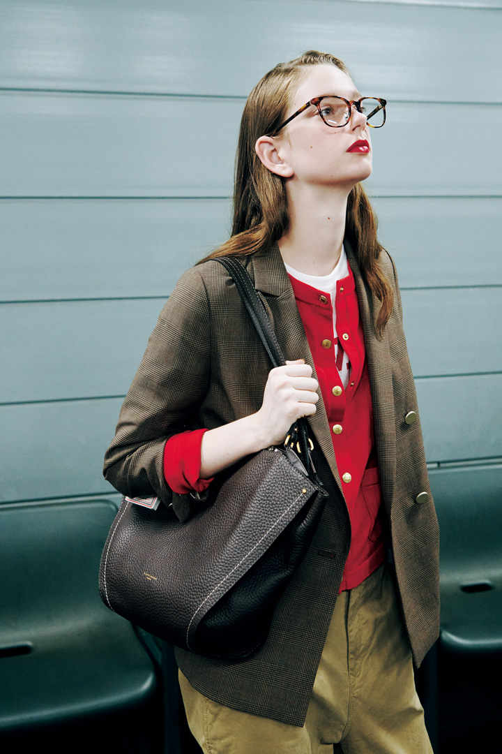 バッグ¥86900/GIANNI CHIARINI( ジャンニ キアリーニ 銀座店)、ジャケット¥17930/green labelrelaxing(ユナイテッドアローズ グリーンレーベル リラクシング ルミネ有楽町店)、カーディガン¥31900/Traditional Weatherwear(トラディショナル ウェザーウェア 渋谷店)、Tシャツ¥9790/Champion(ヘインズブランズ ジャパン カスタマーセンター)、パンツ¥18700/SANDINISTA(トゥー・ステップ)、その他/スタイリスト私物