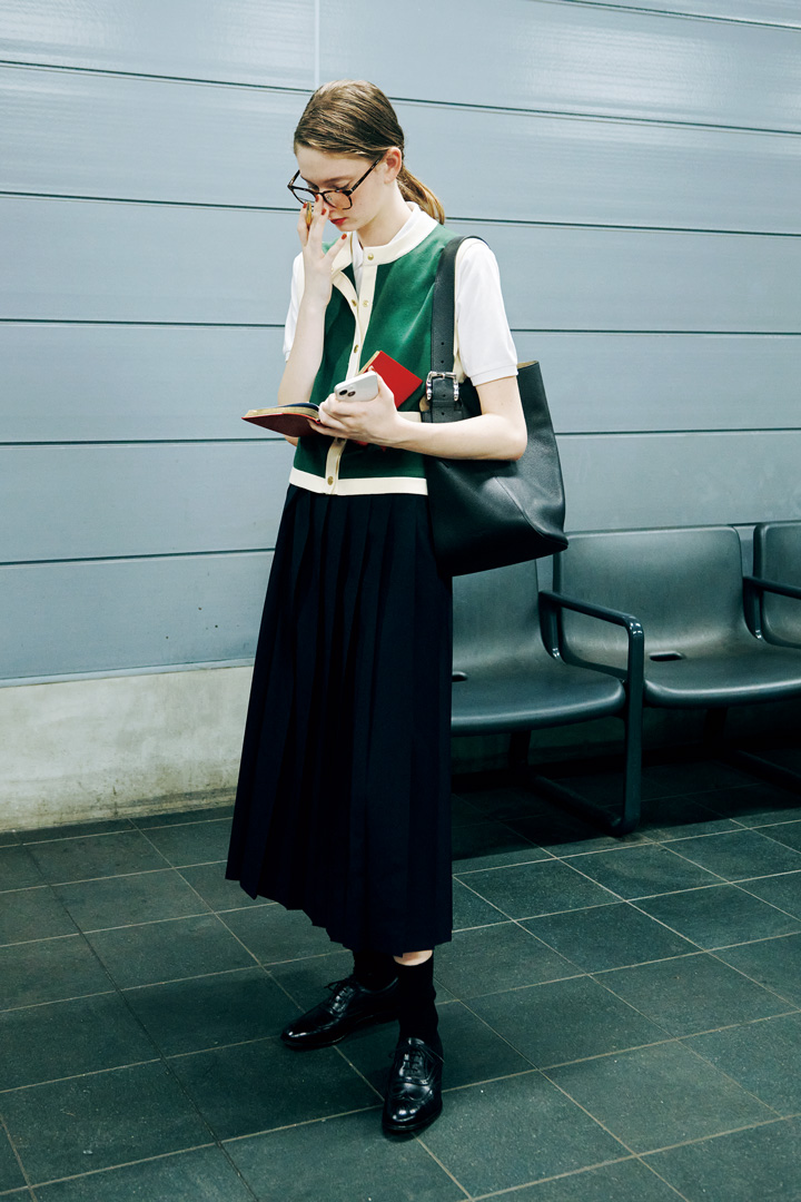 バッグ¥198000/J&M DAVIDSON(J&M デヴィッドソン カスタマーセンター)、ベスト¥25300 /Traditional Weatherwear(トラディショナル ウェザーウェア 渋谷店)、ポロシャツ¥29700/A.P.C.( アー・ペー・セー カスタマーサービス)、スカート¥35200/BRITISH MADE、シューズ¥79200/JOSEPHCHEANEY(ともにブリティッシュメイド 青山本店)、ボールペン¥1320/HIGHTIDE(ハイタイド)、ダイアリー¥46200/SMYTHSON(ルック 事業本部)、その他/スタイリスト私物